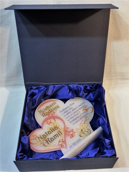 Na pleksie wykonany jest bezpośredni nadruk dedykacji, ozdobnych grafik czy zdjęcia Jubilatów.