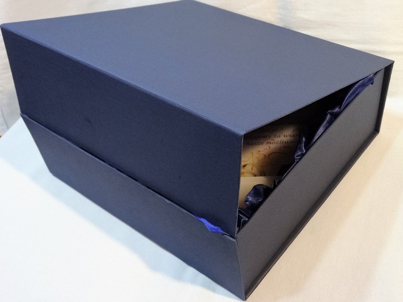 Do statuetki można dodatkowo zamówić składane etui kartonowe, wyściełane materiałem, w kolorze niebieskim.
