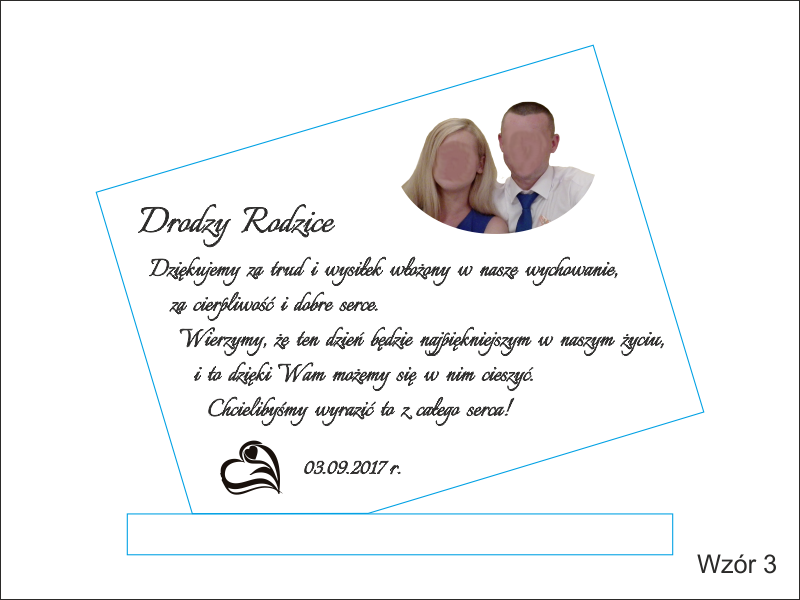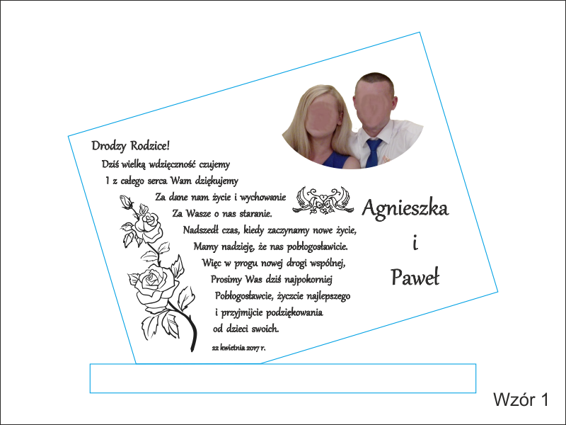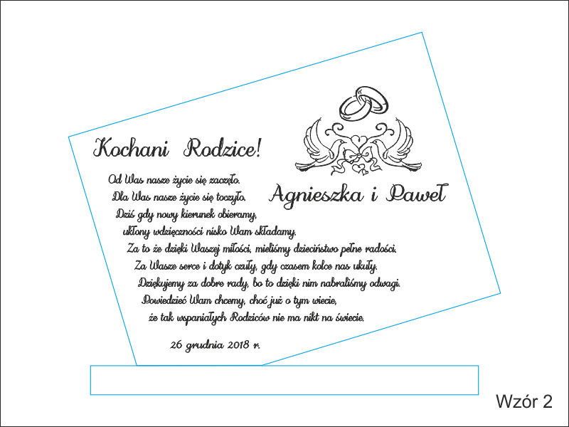 Na statuetce wykonany jest grawer ozdobnych grafik i dedykacji z podziękowaniem dla rodziców na pamiątkę ślubu.