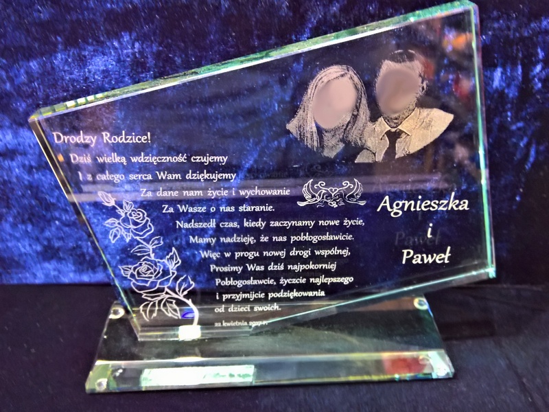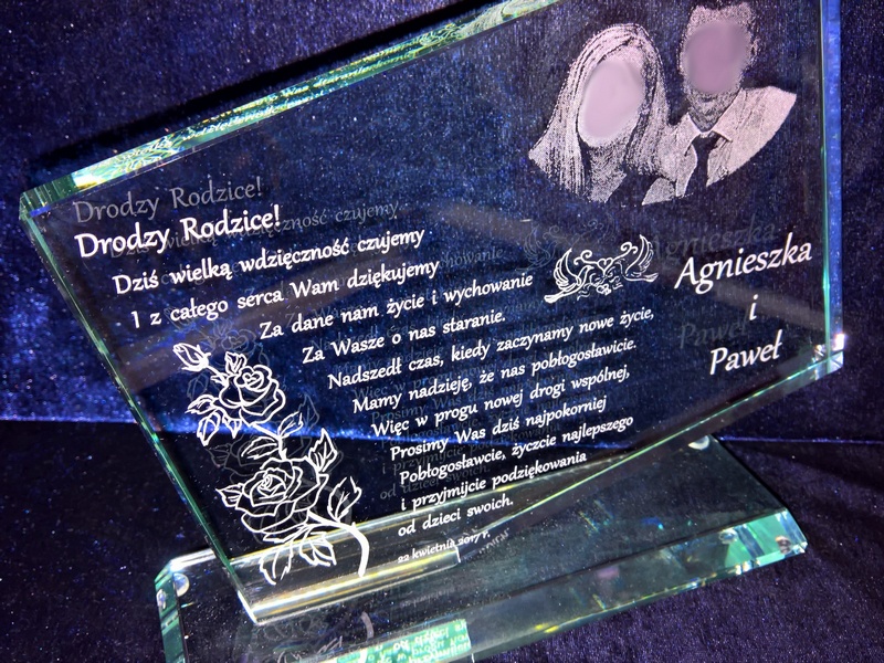 Pamiątkę z grawerem dla rodziców można także wykonać na innych modelach statuetek szklanych.