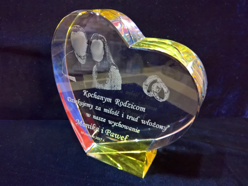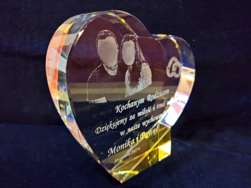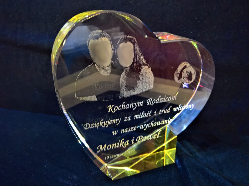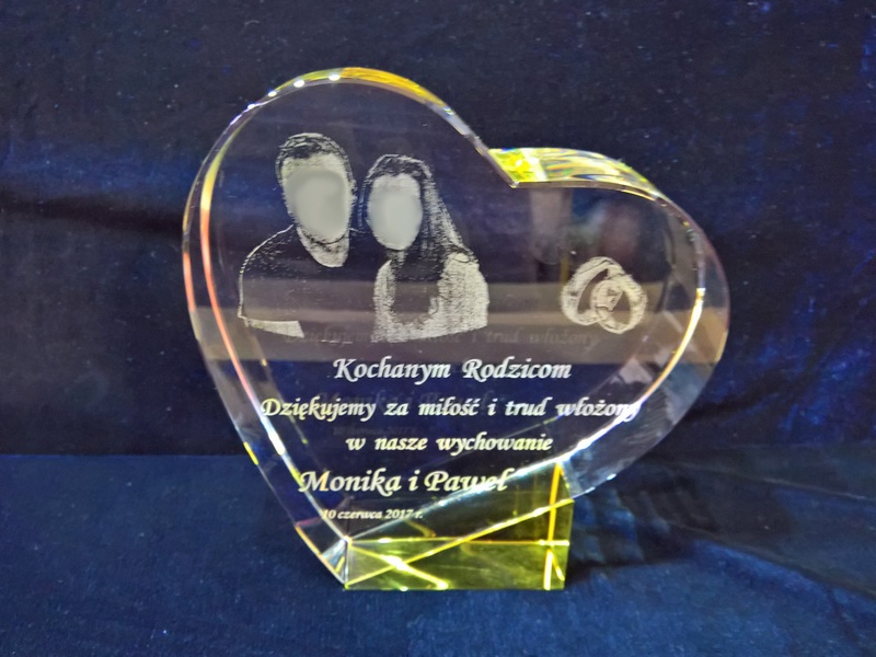 Pamiątkę z grawerem dla rodziców można także wykonać na innych modelach statuetek szklanych.