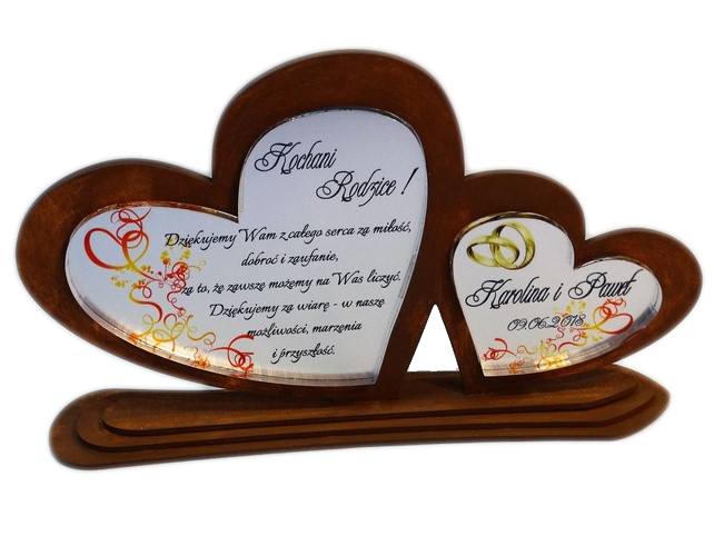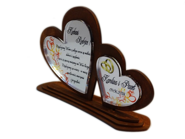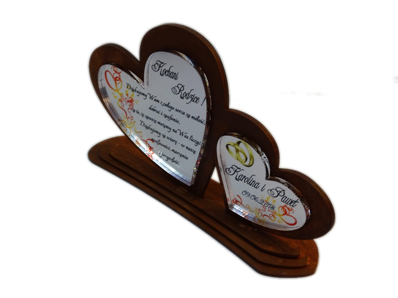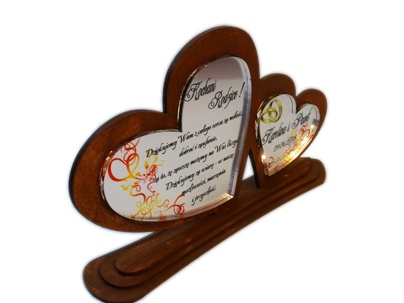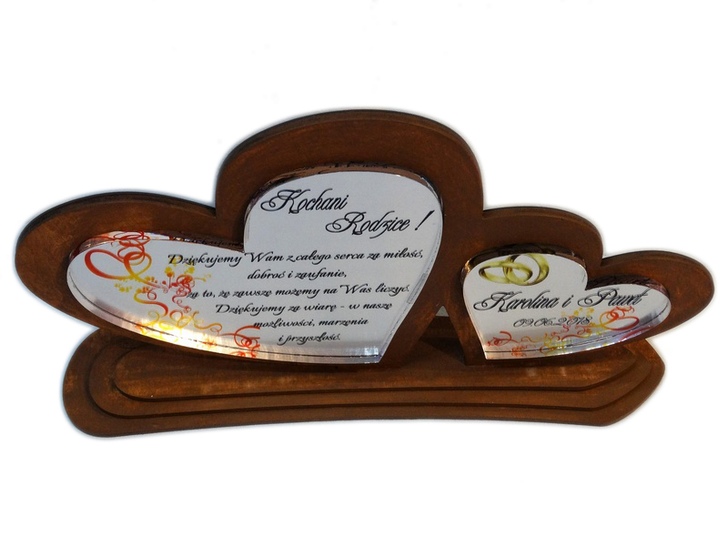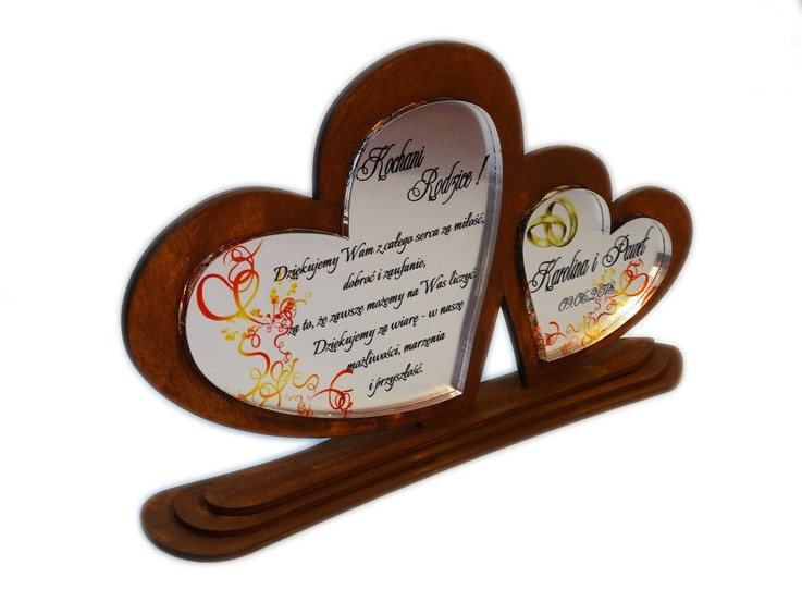 Podziękowanie od Młodych dla Rodziców ma formę statuetki wykonanej z pleksy i drewnianej sklejki.