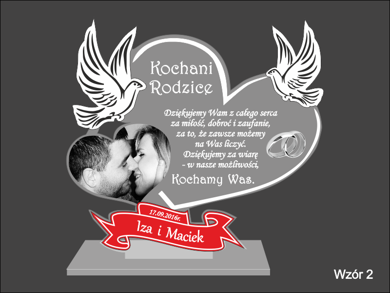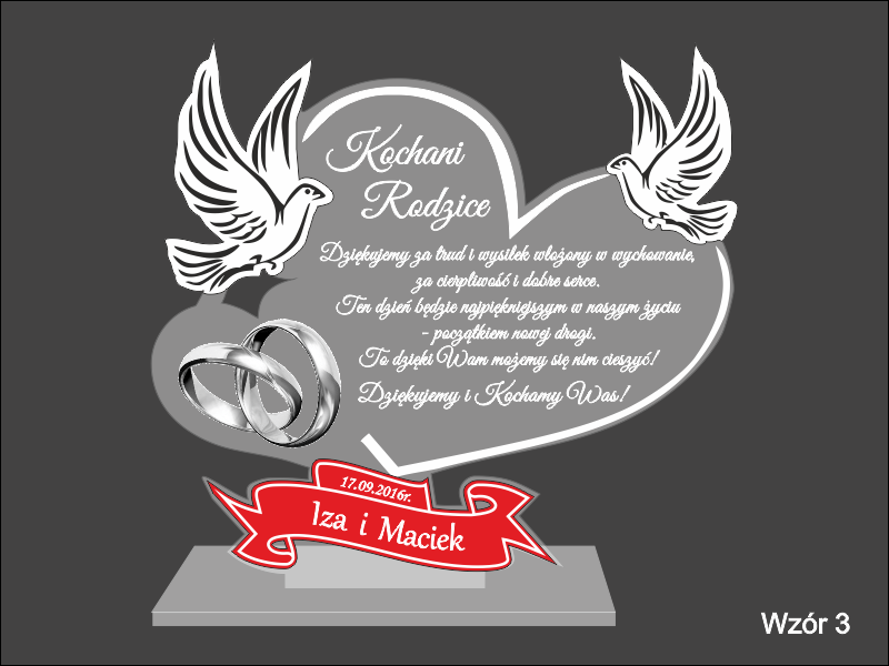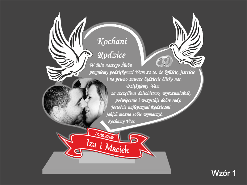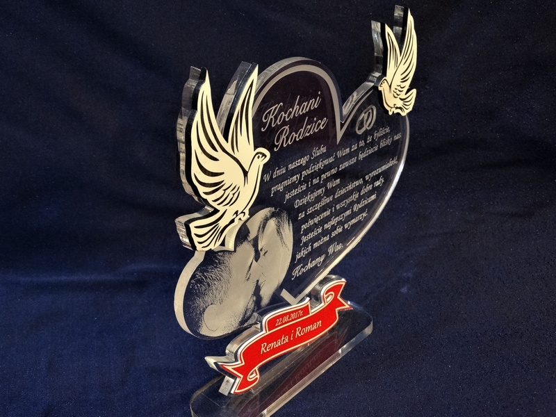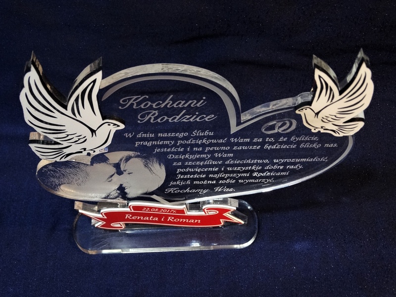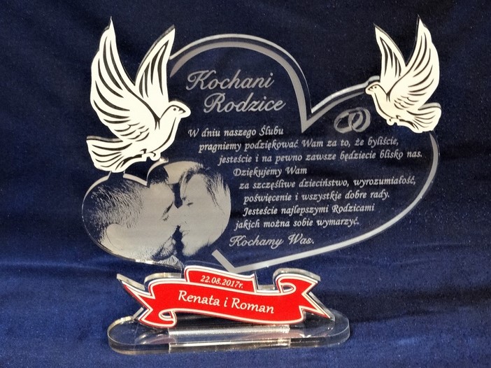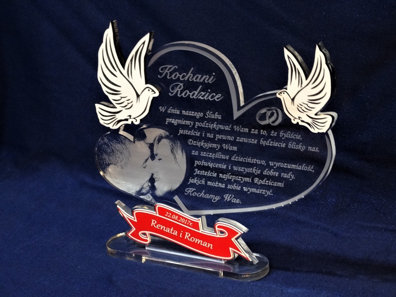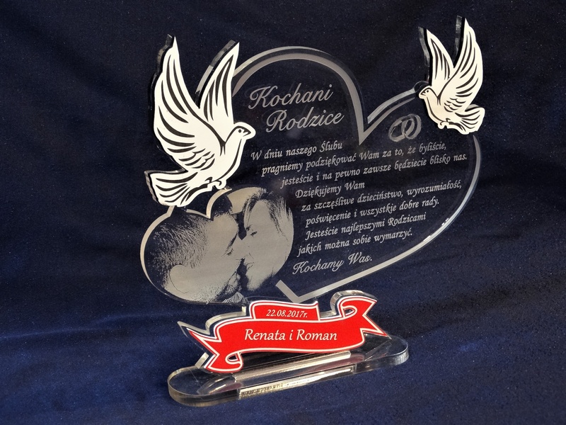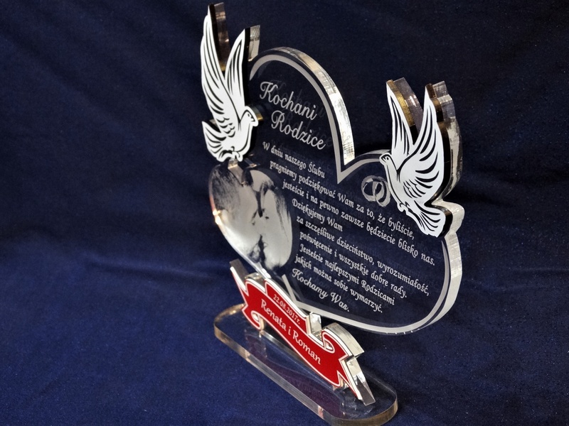 Na wyciętym z bezbarwnej pleksy sercu wykonany jest grawer dedykacji, ozdobnej grafiki oraz życzeń z podziękowaniem dla rodziców.