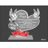 Statuetka ma kształt serca z dwoma gołąbkami po bokach oraz wstęgą poniżej.