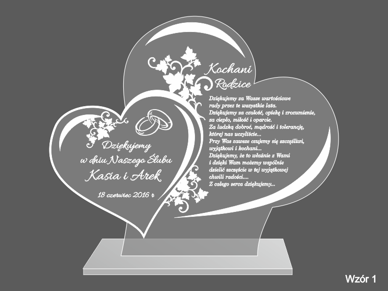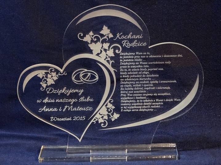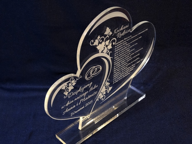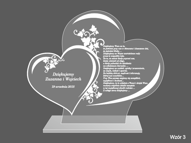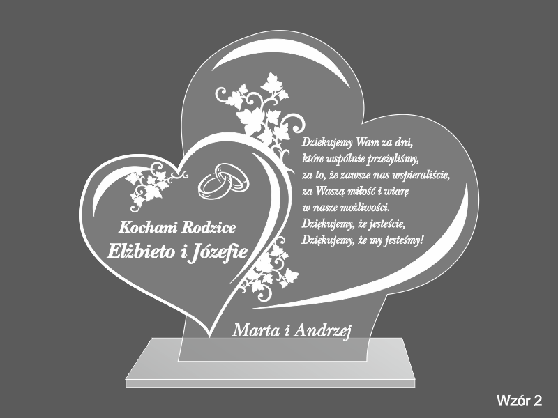 W projekcie statuetki oprócz motywu dwóch połączonych serc wygrawerowano dedykację oraz ozdobne grafiki.