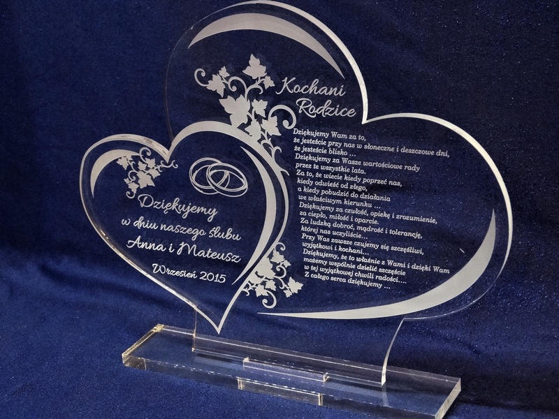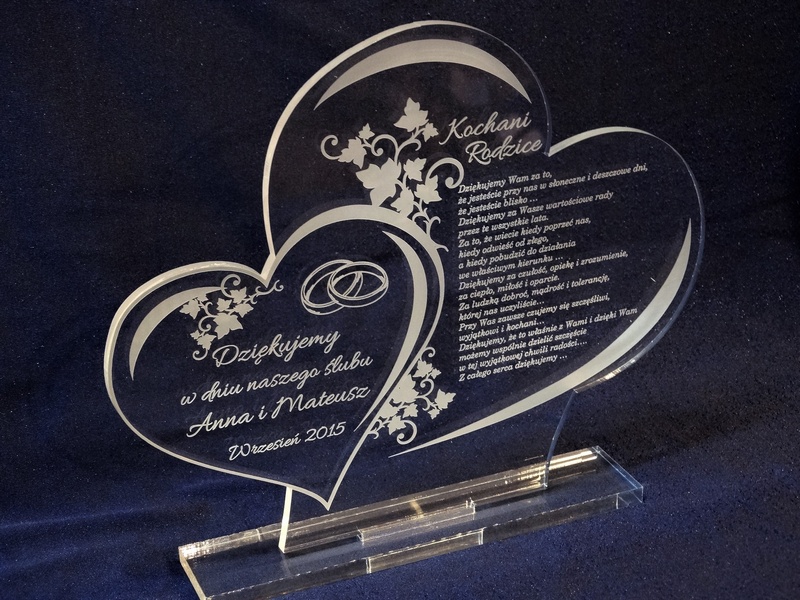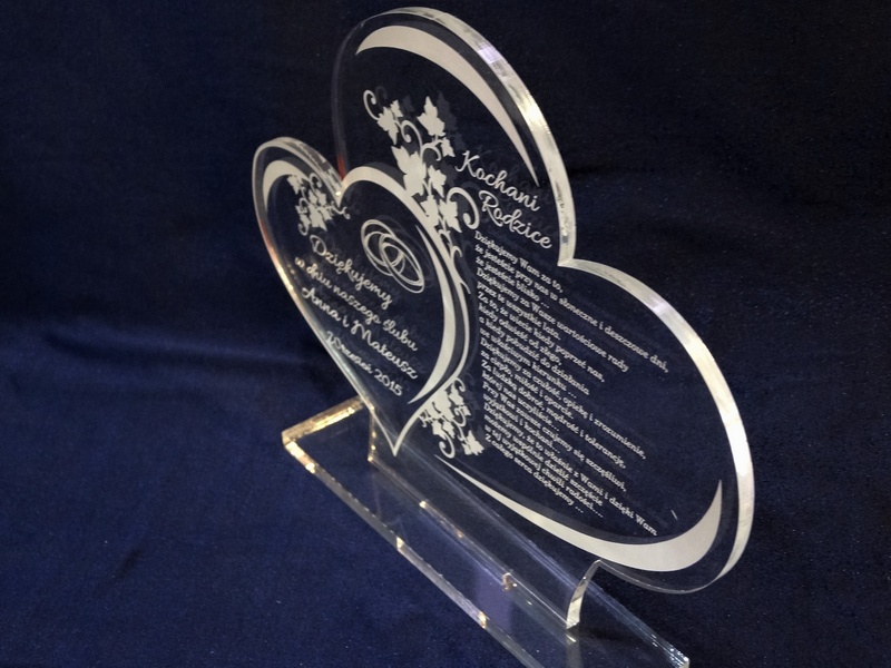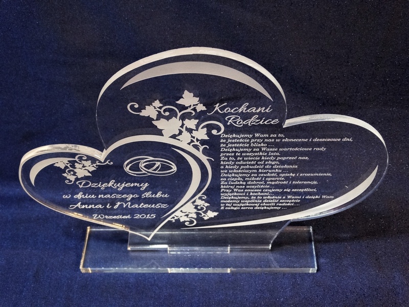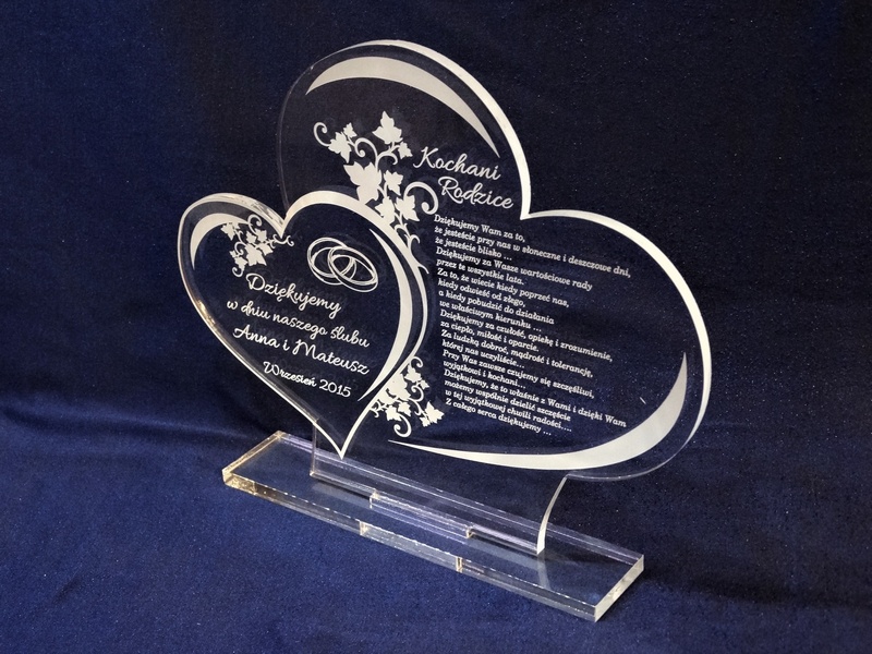 Podziękowanie dla Rodziców wykonane jest w formie statuetki z pleksi z grawerem dedykacji.