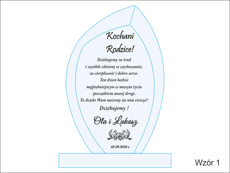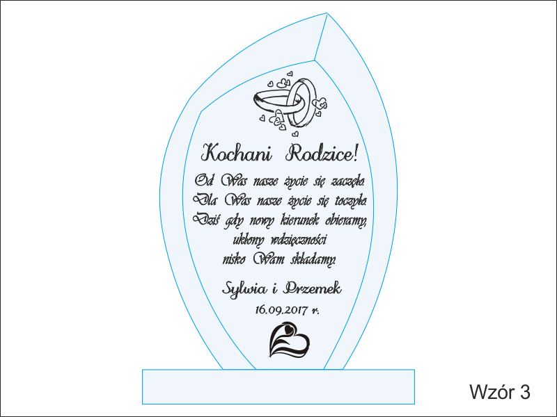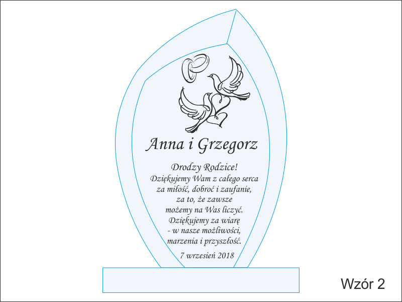Na statuetce wykonany jest grawer ozdobnych grafik i dedykacji z podziękowaniem dla rodziców na pamiątkę ślubu.