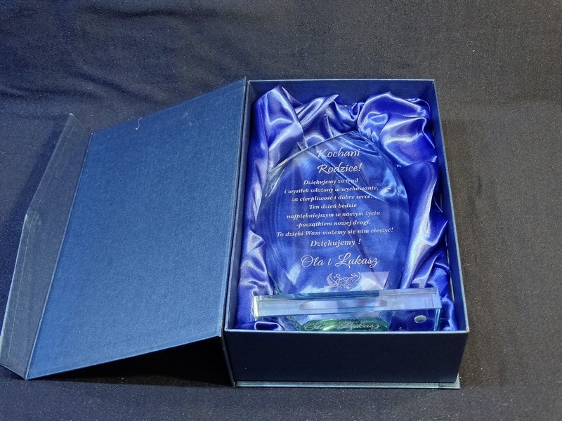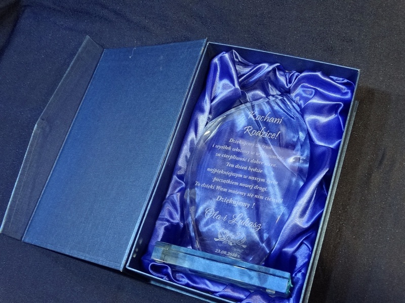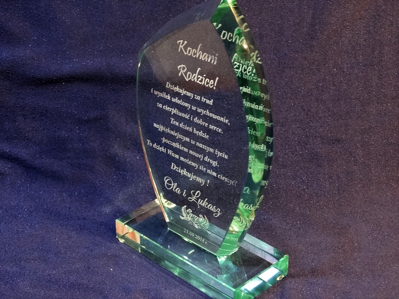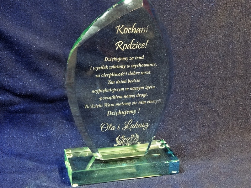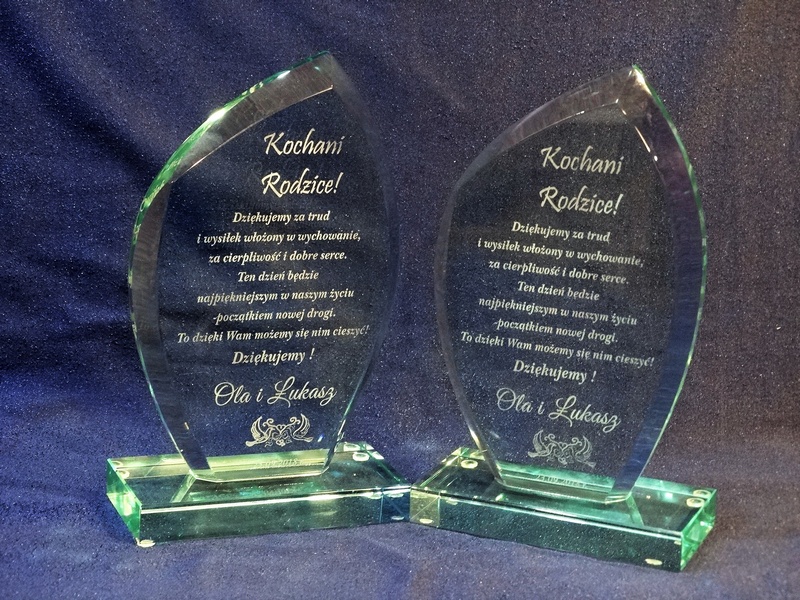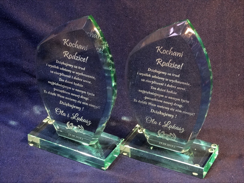 Pamiątkę z grawerem dla rodziców można także wykonać na innych modelach statuetek szklanych.