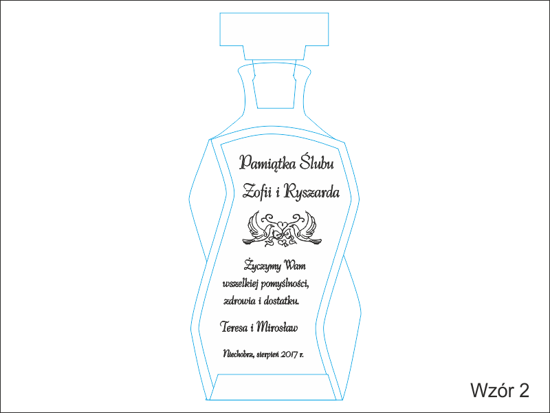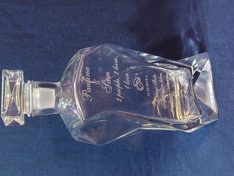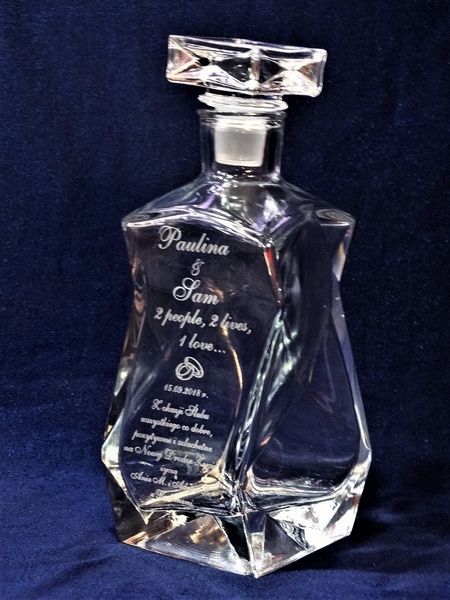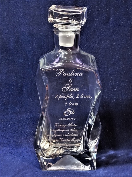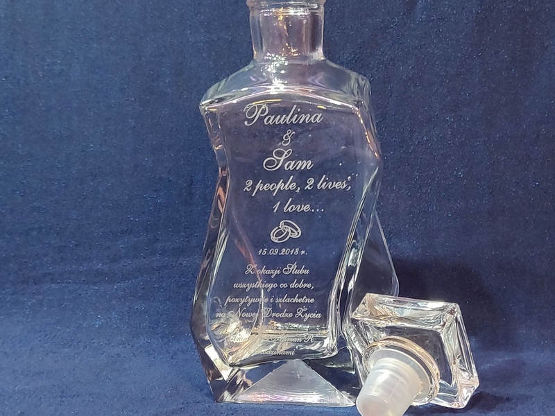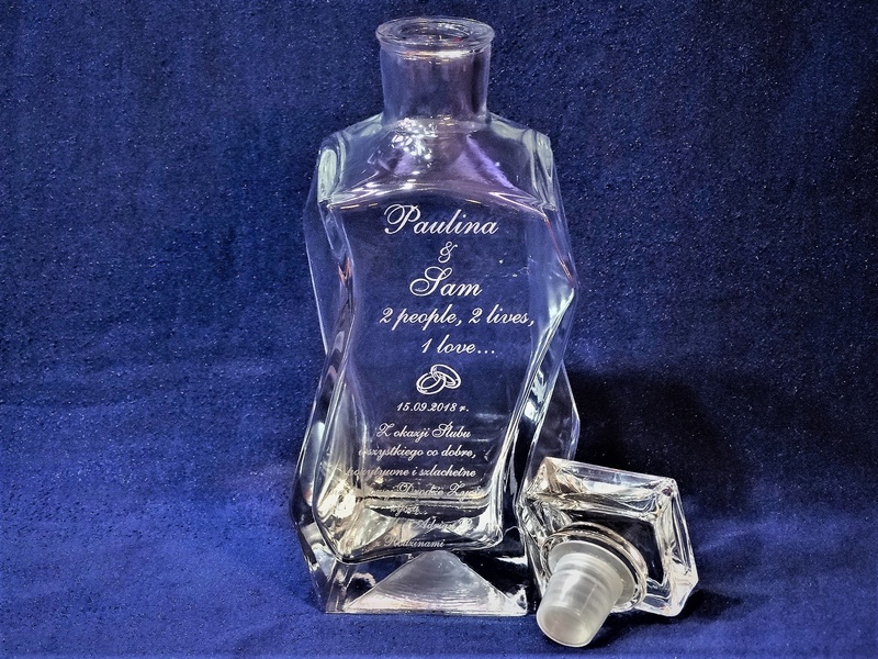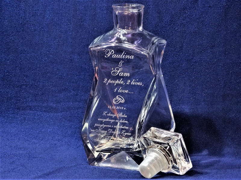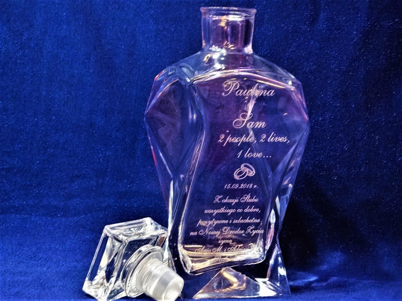 Prezent ślubny w postaci karafki łamanej z grawerem okolicznościowej dedykacji i grafik.