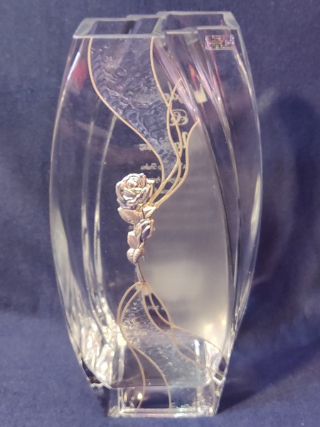 Prezent na ślub dla Państwa Młodych w formie zdobionego szklanego wazonu Alina ze srebrną różą i grawerem dedykacji.