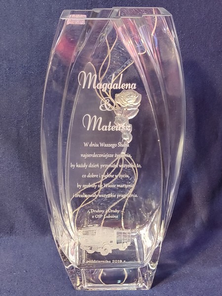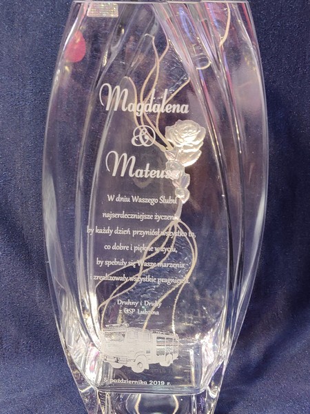 Na wazonie wykonany jest grawer ozdobnych grafik i dedykacji na pamiątkę zawarcia małżeństwa.