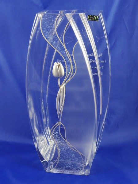 Prezent z okazji ślubu dla Państwa Młodych w postaci zdobionego wazonu szklanego Verona z ozdobnym srebrnym tulipanem.