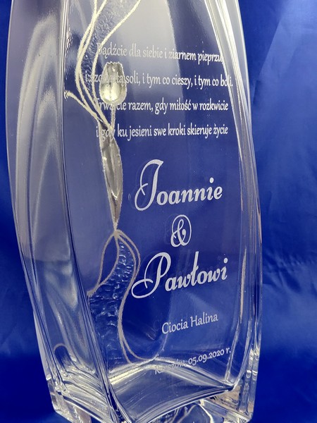 Na wazonie wykonany jest grawer dedykacji i ozdobnych grafik z okazji ślubu.