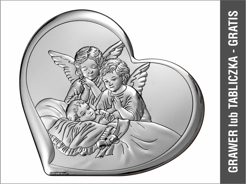 - obrazek srebrny w kształcie serca przedstawiający Aniołki nad dzieckiem