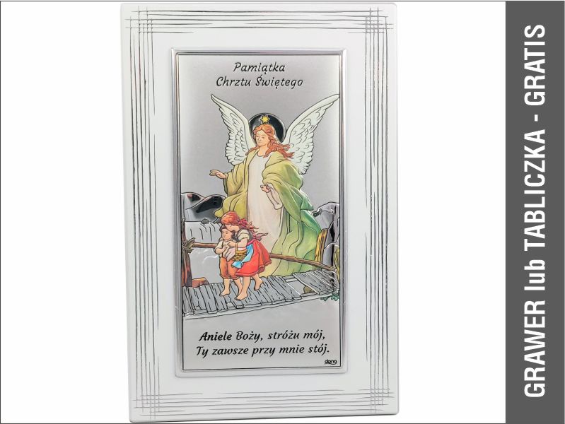 - malowany obrazek srebrny przedstawiający Anioła Stróża nad dziećmi z napisem