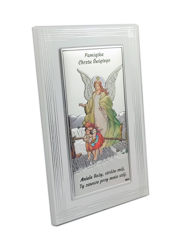 Srebrny Obrazek "Anioł Stróż nad dziećmi na kładce na białym drewnie z napisem i modlitwą DS43F/C" kolorowy.