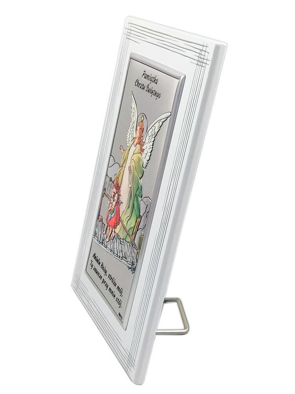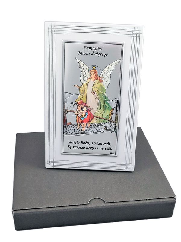 Srebrny obrazek ma prostokątny kształt i przedstawia Anioła Stróża czuwającego nad dziećmi na kładce.