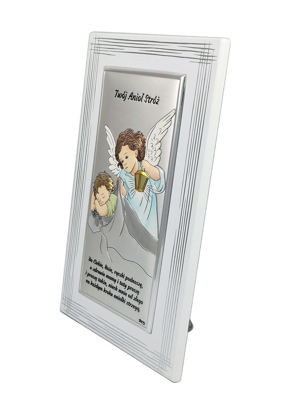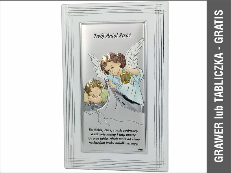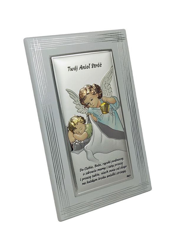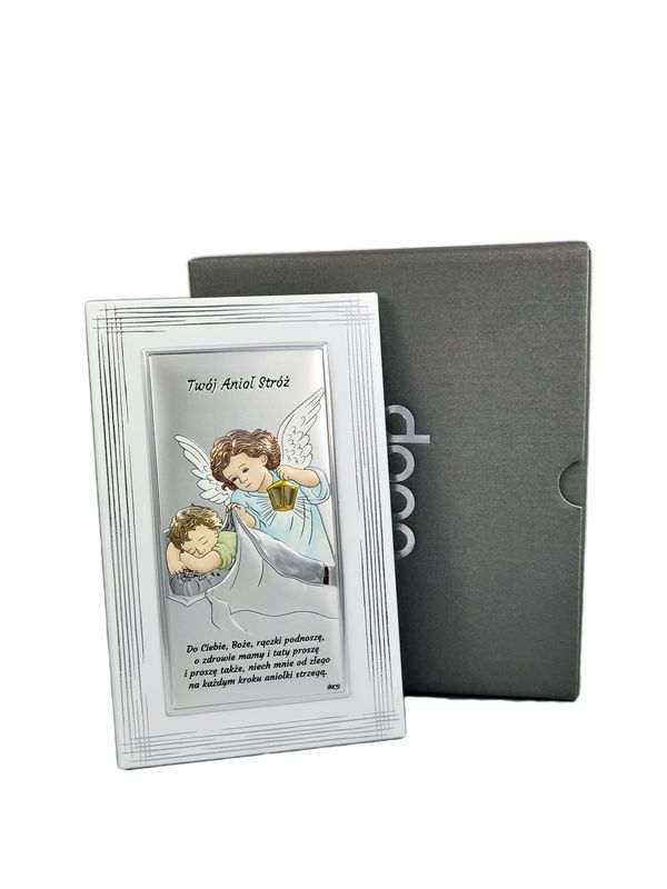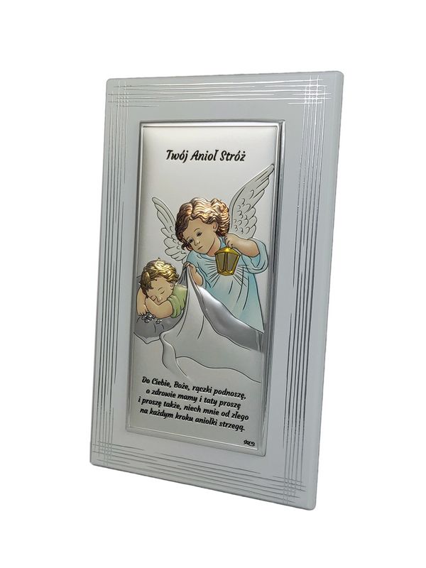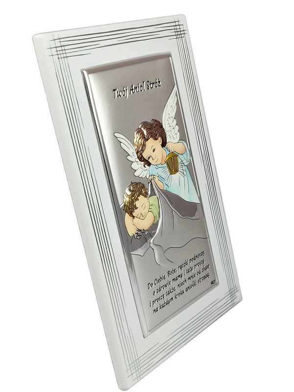 Srebrny obrazek ma prostokątny kształt i przedstawia Anioła Stróża z latarenką czuwającego nad śpiącym dzieckiem.
