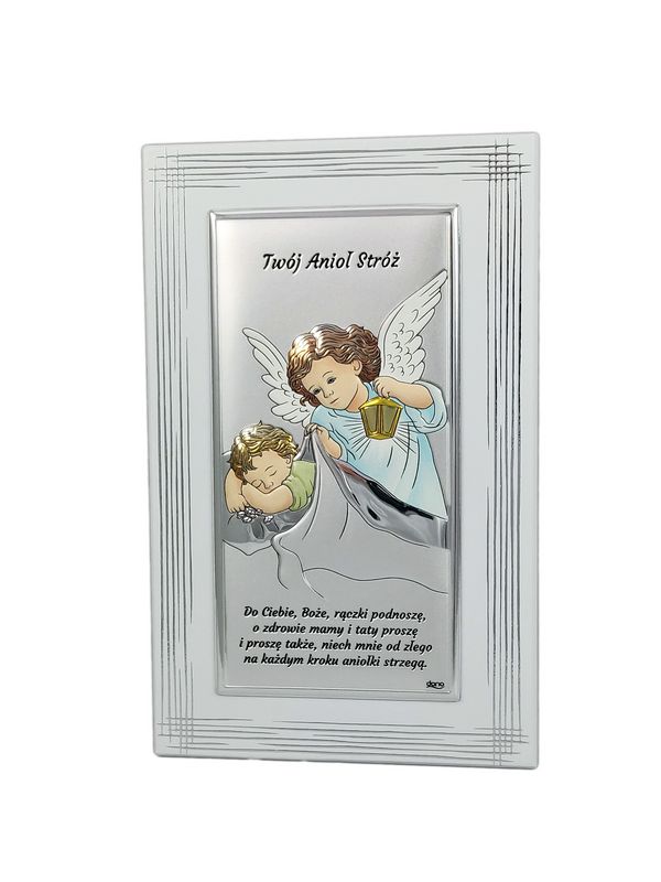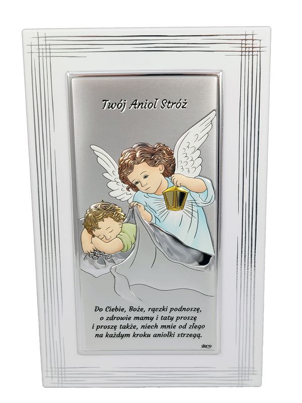 Srebrny obrazek kolorowy "Anioł Stróż z latarenką nad śpiącym dzieckiem na białym drewnie z modlitwą DS02F/C".