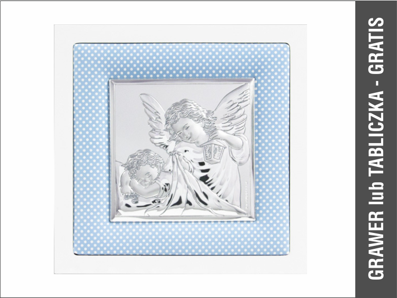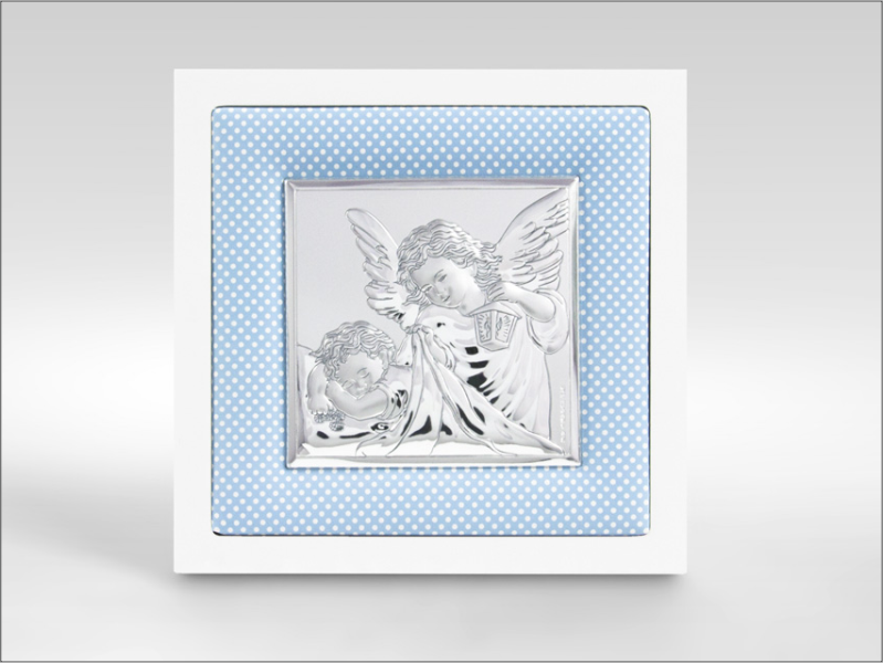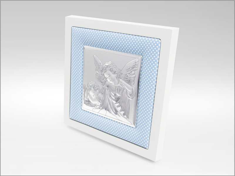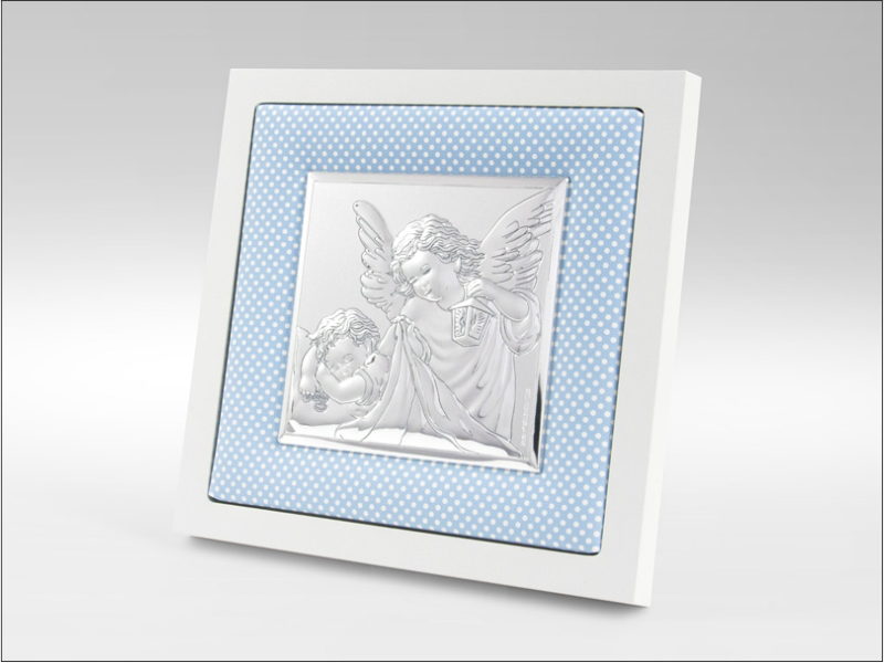 Srebrny Obrazek "Aniołek z latarenką nad dzieckiem na niebieskim materiale z białą drewnianą ramką 75020/C".