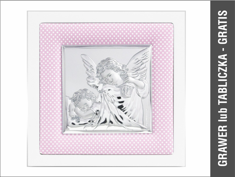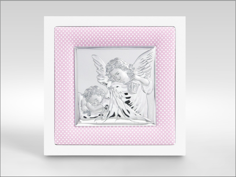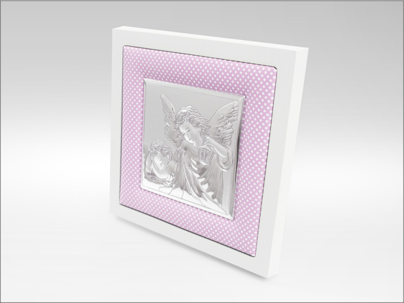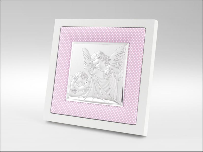 Srebrny Obrazek "Aniołek z latarenką nad dzieckiem na różowym materiale z białą drewnianą ramką 75020/RA".