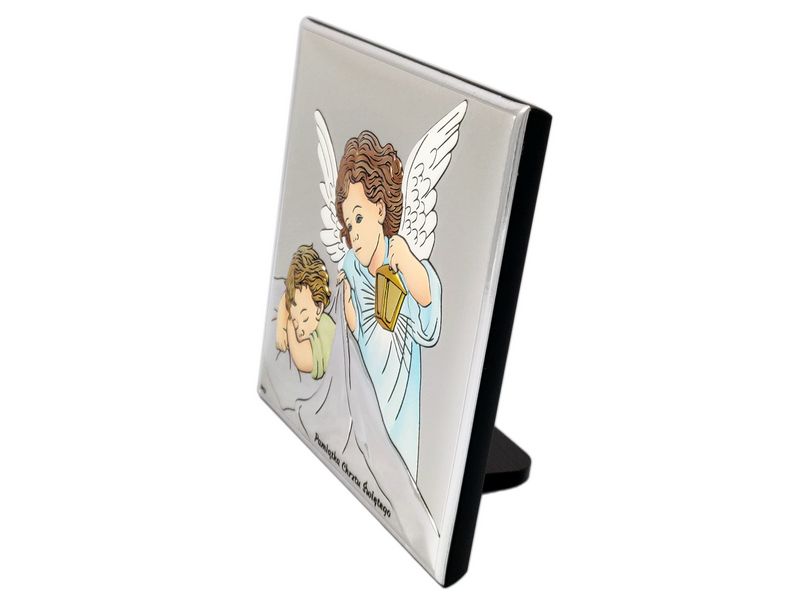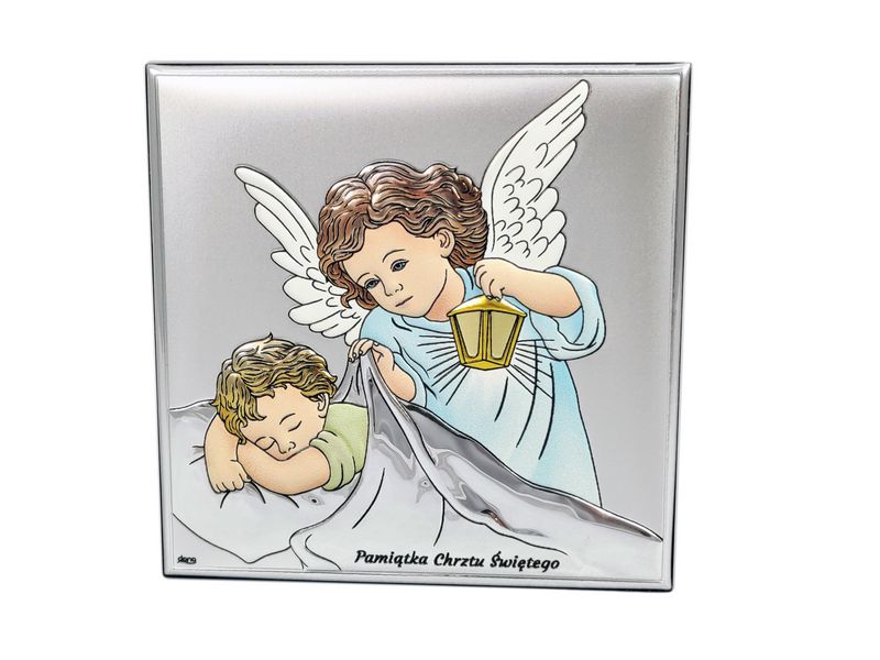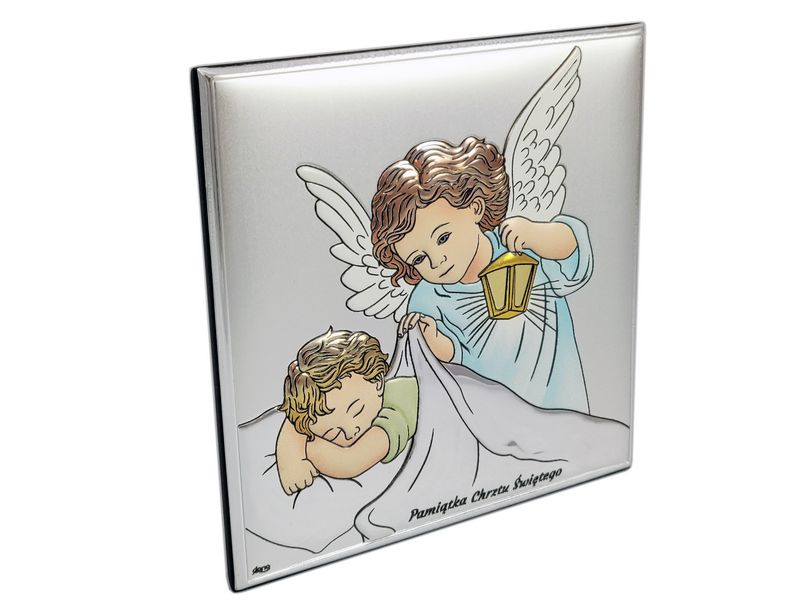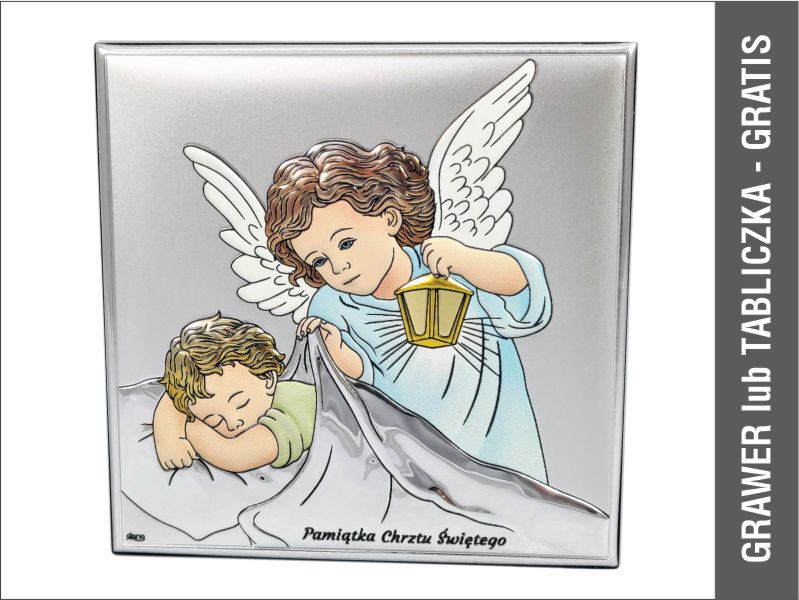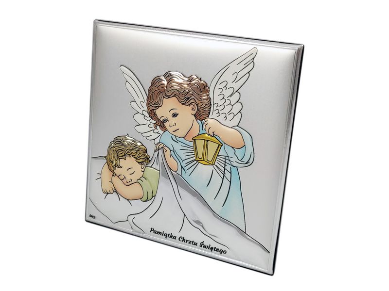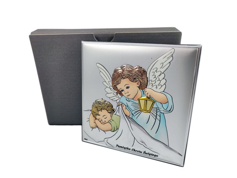 Srebrny obrazek ma kwadratowy kształt i przedstawia Aniołka z latarenką czuwającego nad śpiącym dzieckiem.