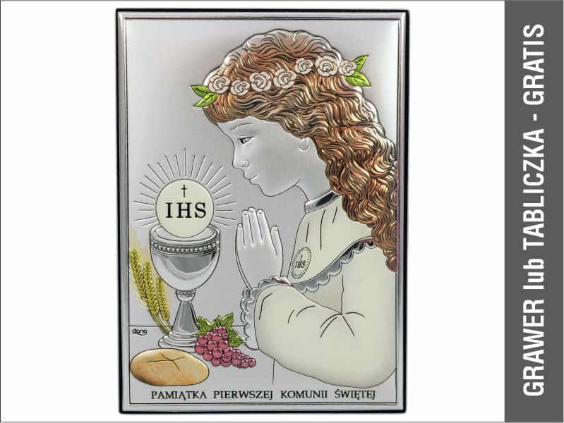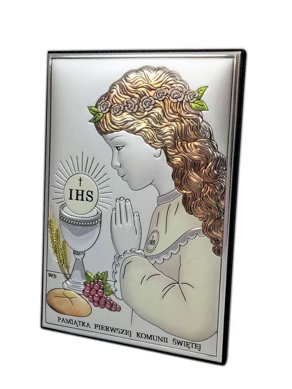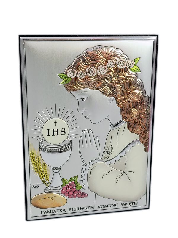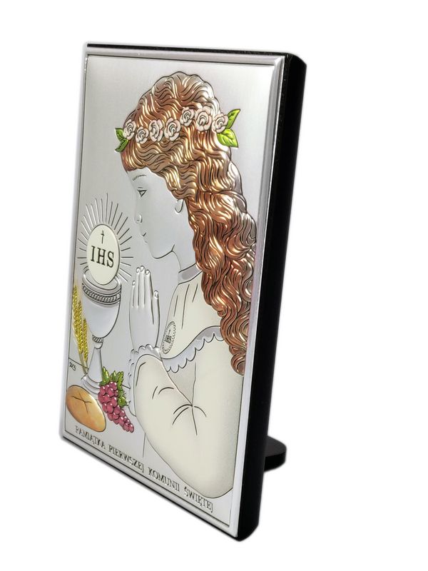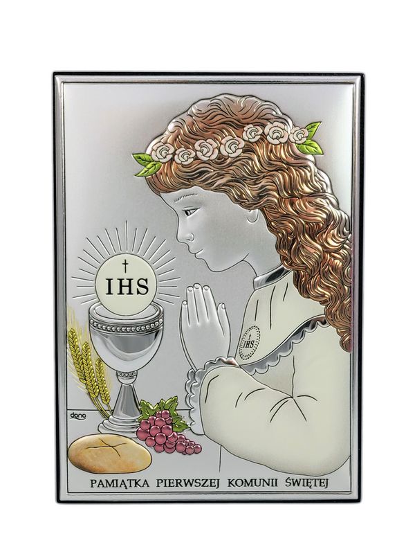 Srebrny obrazek prostokątny "Pamiątka I Komunii Świętej z dziewczynką DS04/C" kolorowy.
