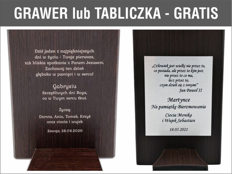 Grawer dedykacji wykonany jest bezpośrednio w drewnie lub na stolej tabliczce.