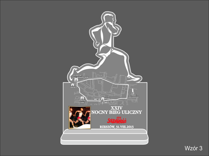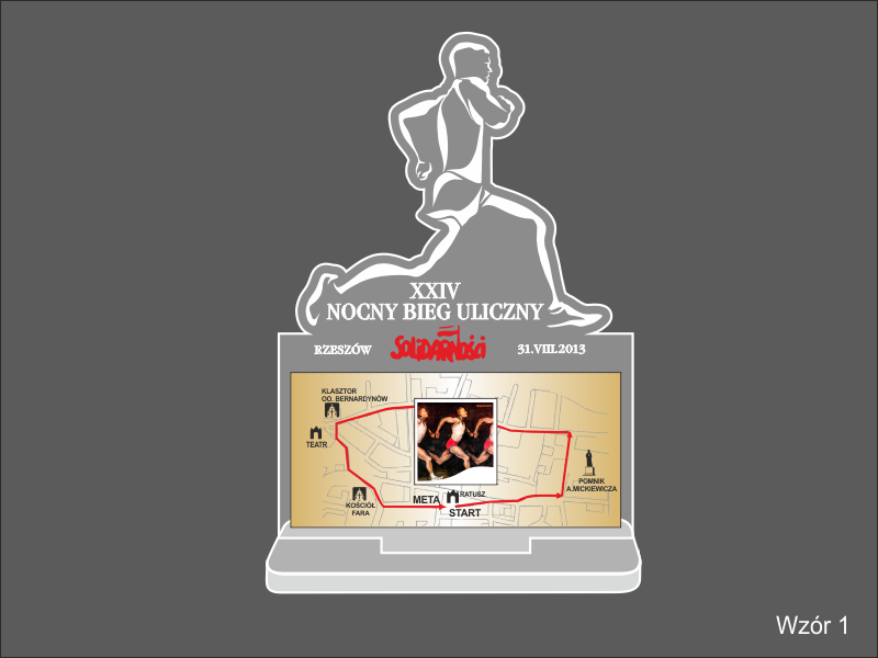 W projekcie statuetki wykorzystano kształt biegacza oraz plan trasy biegu.