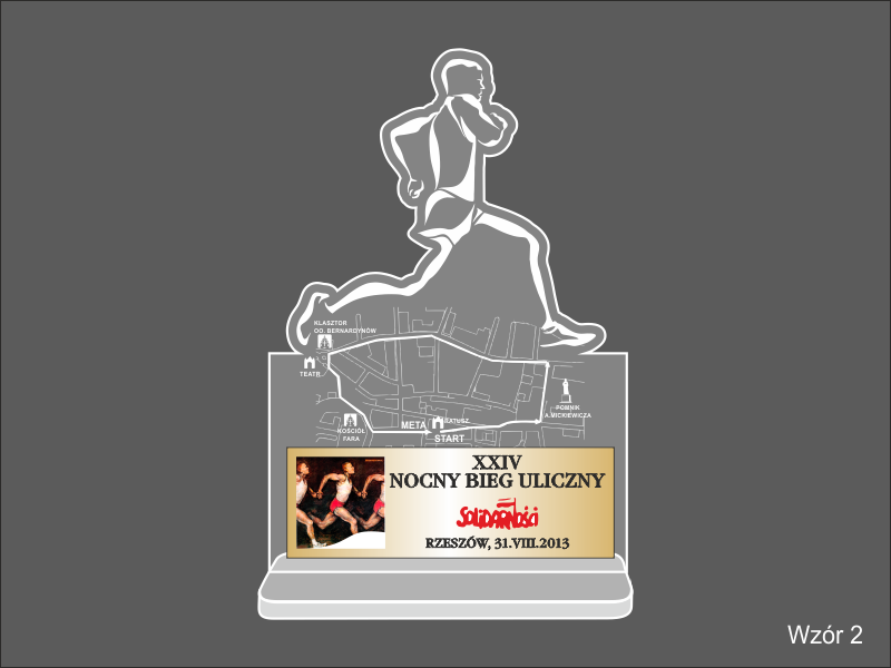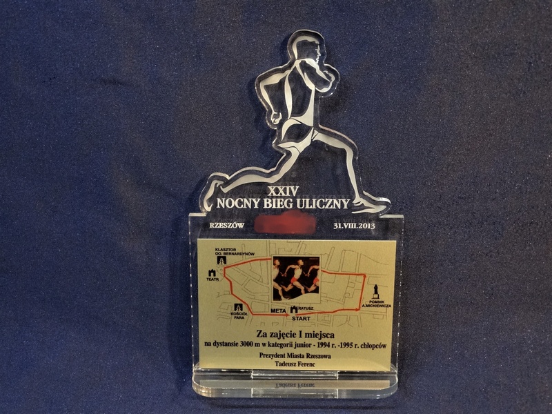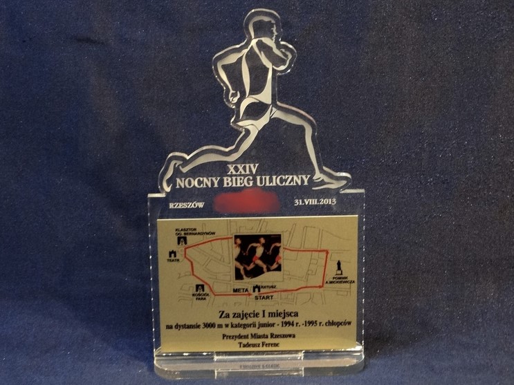 Sylwetka biegacza jest grawerowana, a trasa, logotyp i dedykacja nadrukowana na blaszce.