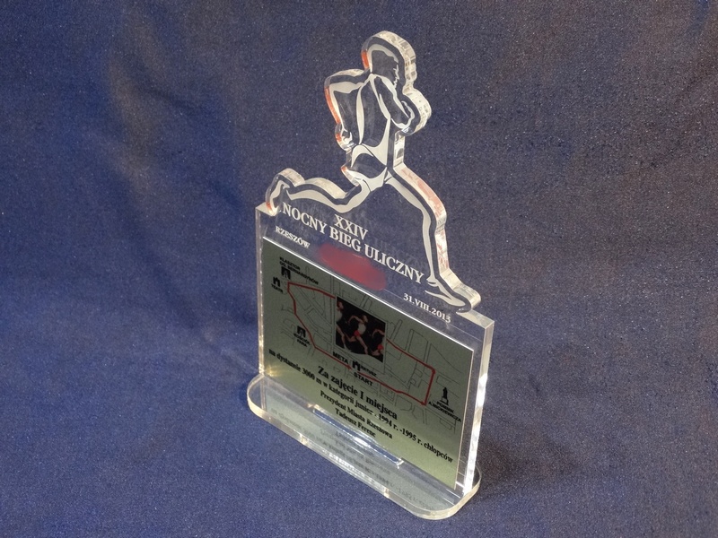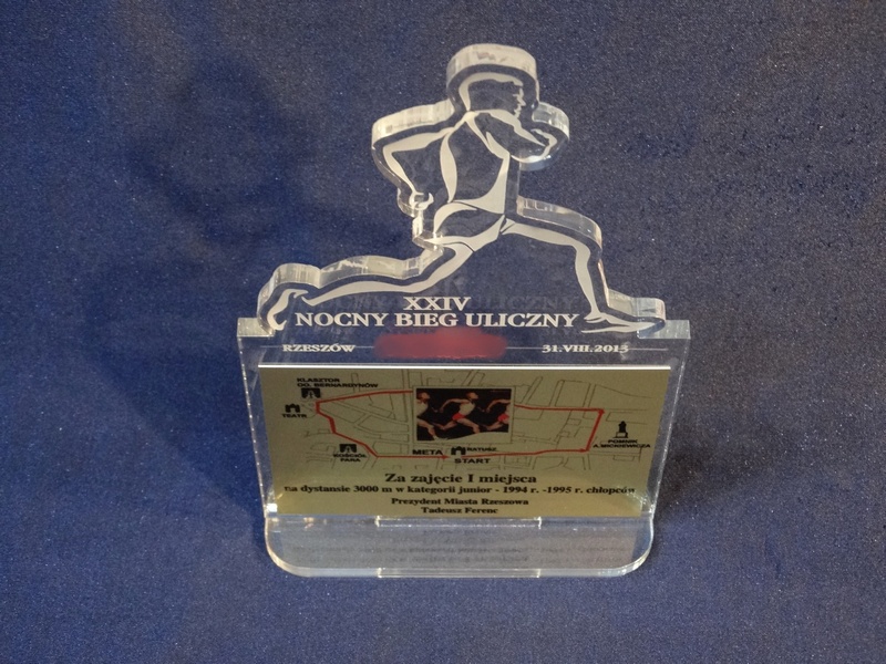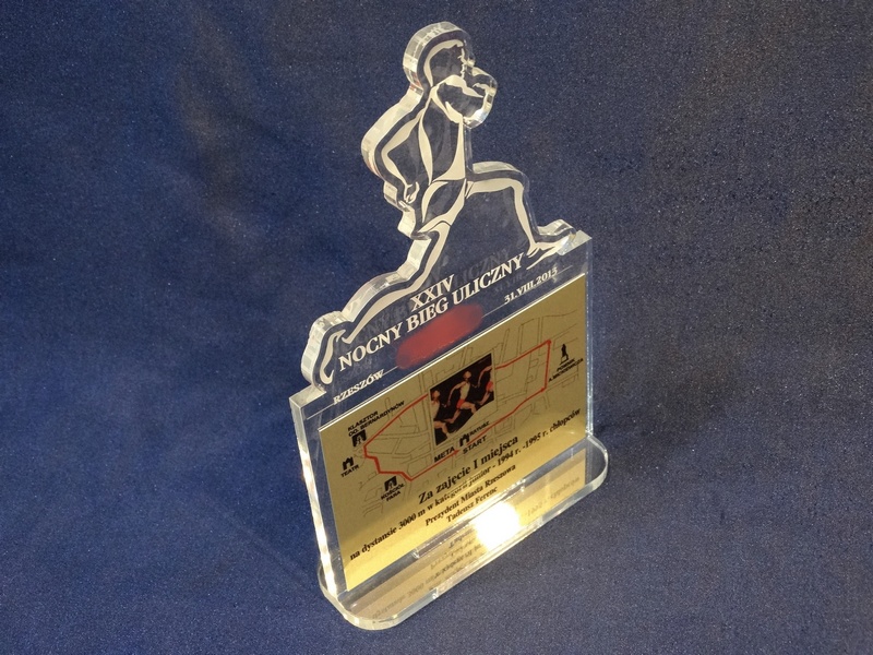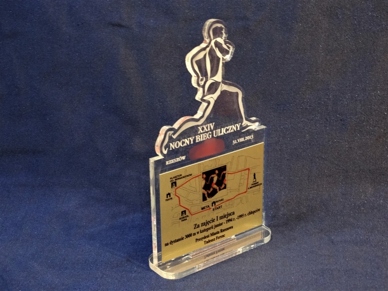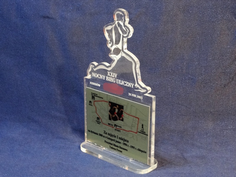 Statuetka Biegi wykonana z bezbarwnej pleksi z grawerem oraz nadrukiem dedykacji, logotypu, emblematu i ozdobnych grafik.