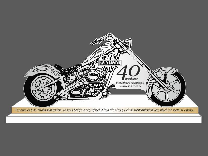 Kształt i postument wycięty jest z białej pleksi, na której umieszczony jest srebrny i złoty laminat z grawerem dedykacji.