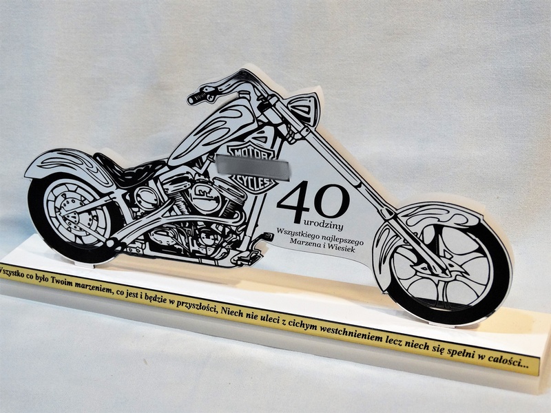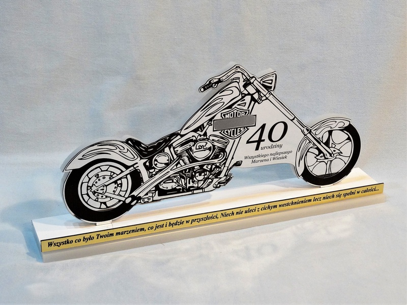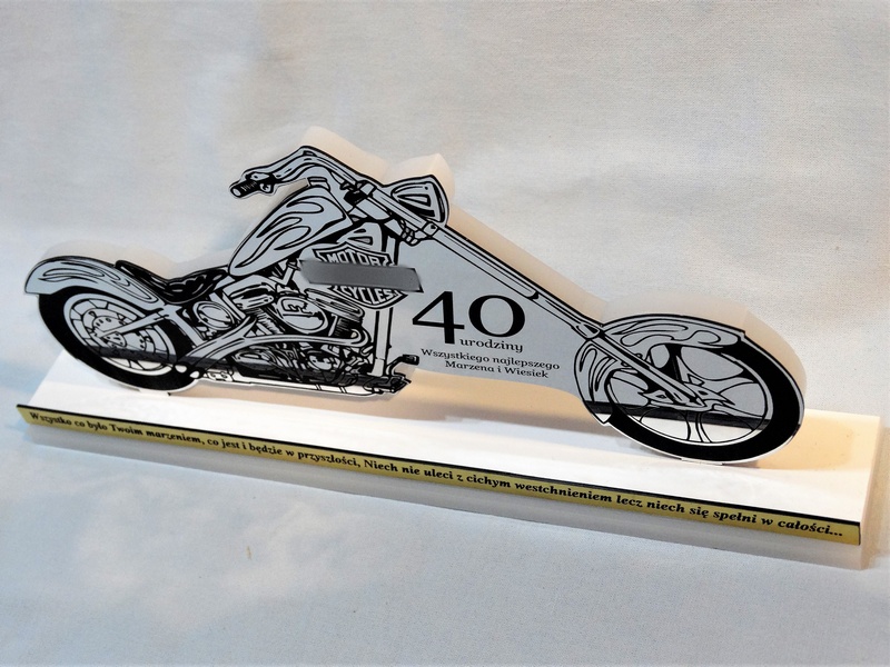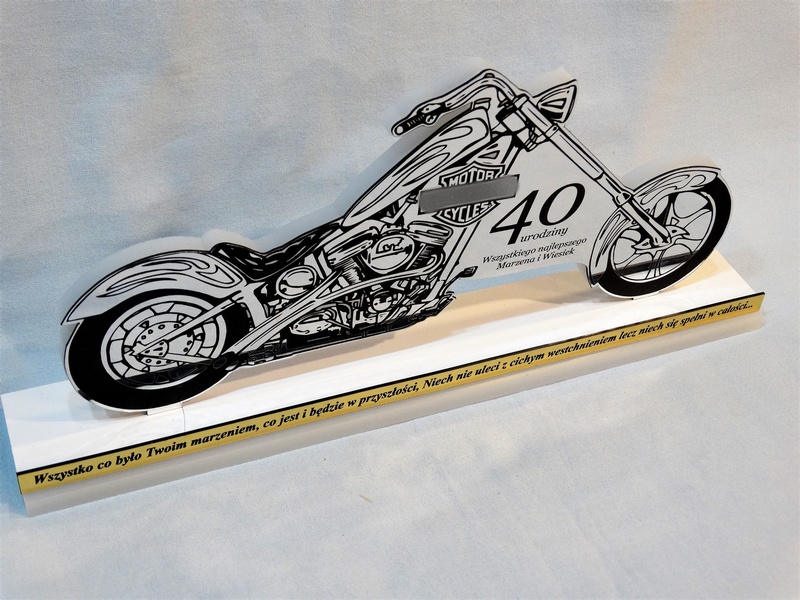 Statuetka Motor wykonana z białej pleksi oraz srebrnego i złotego laminatu, z grawerem dedykacji i ozdobnych grafik.