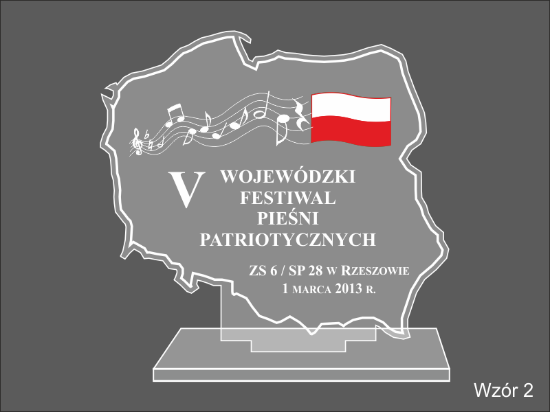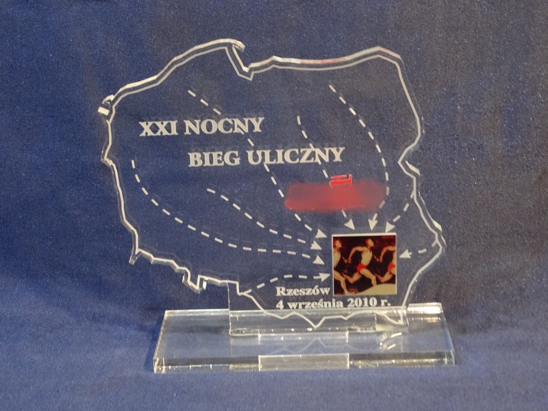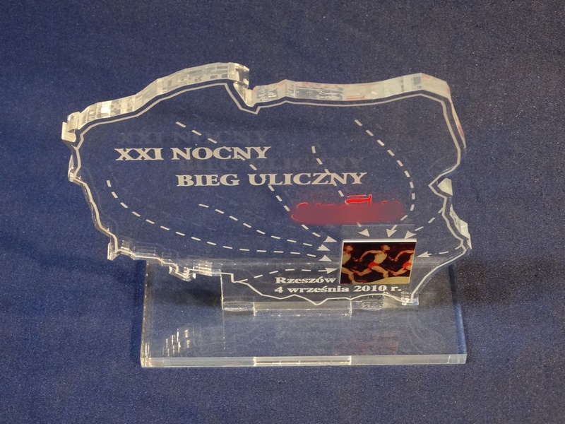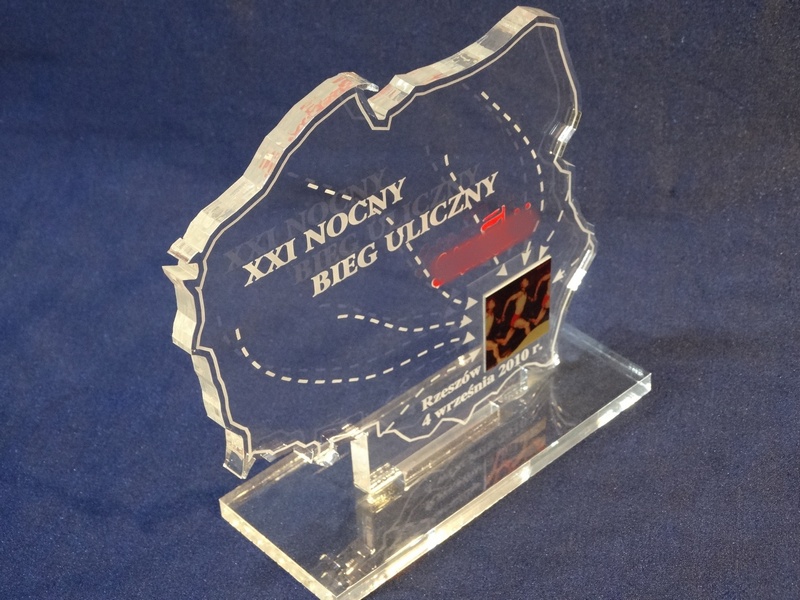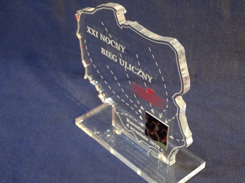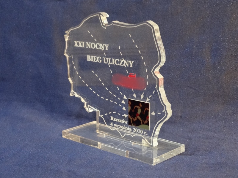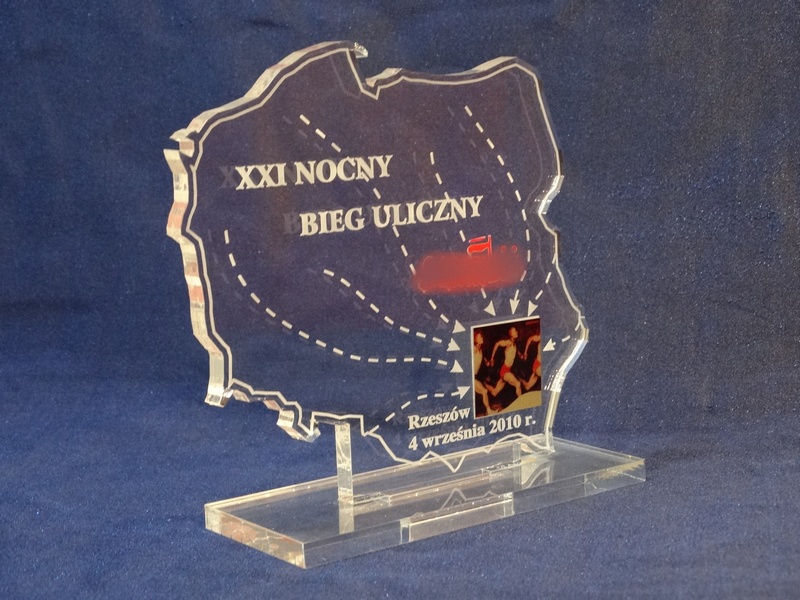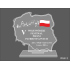 Statuetka "Polska" wykonana z bezbarwnej pleksi z grawerem i nadrukiem dedykacji, logotypu, emblematu i ozdobnych grafik.