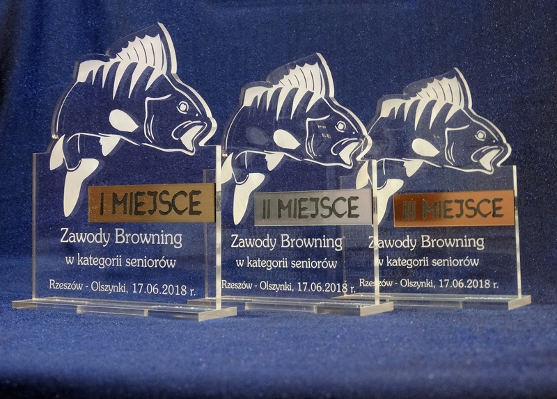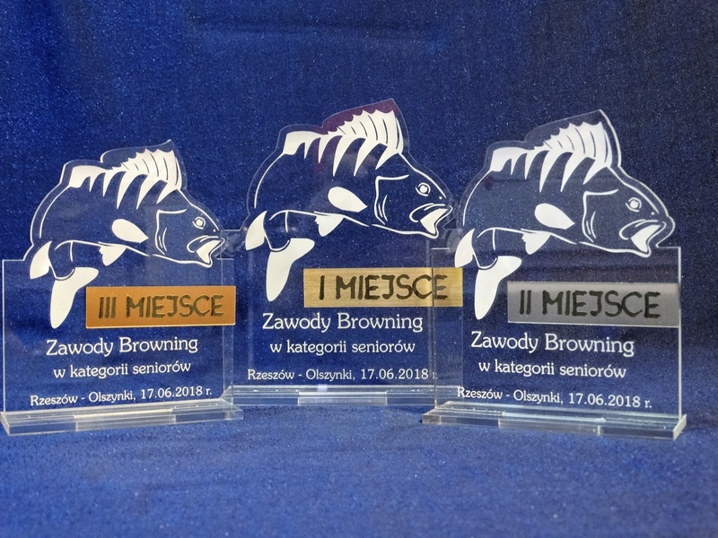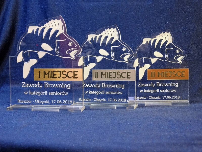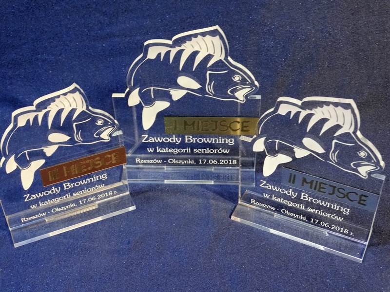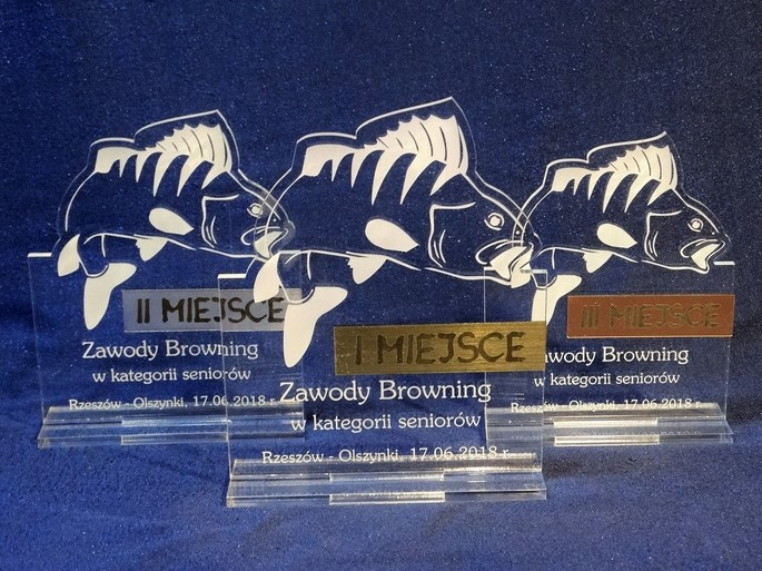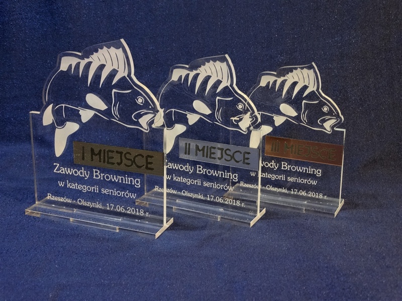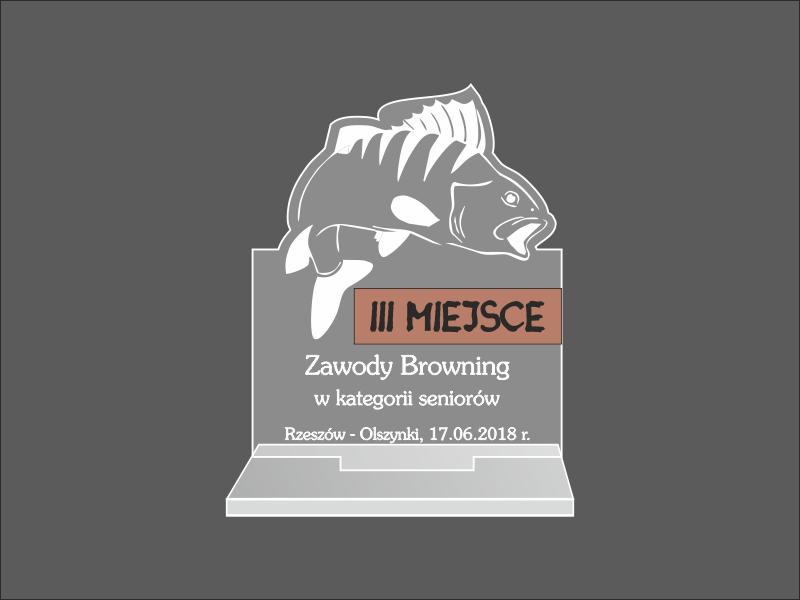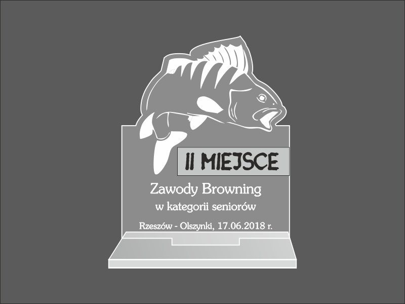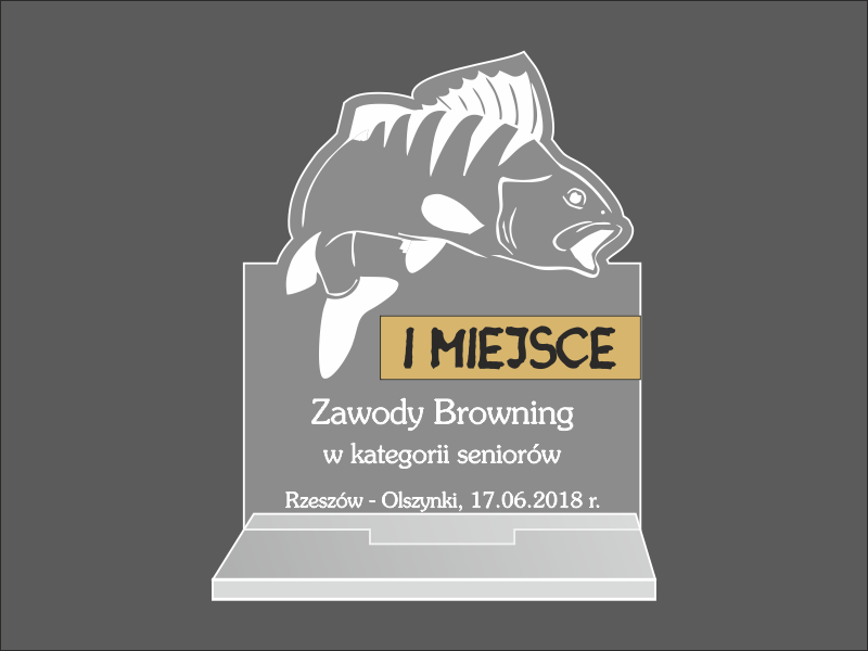 Statuetka Ryba wykonana z bezbarwnej pleksi i laminatu z grawerem dedykacji, logotypu, emblematu i grafik.