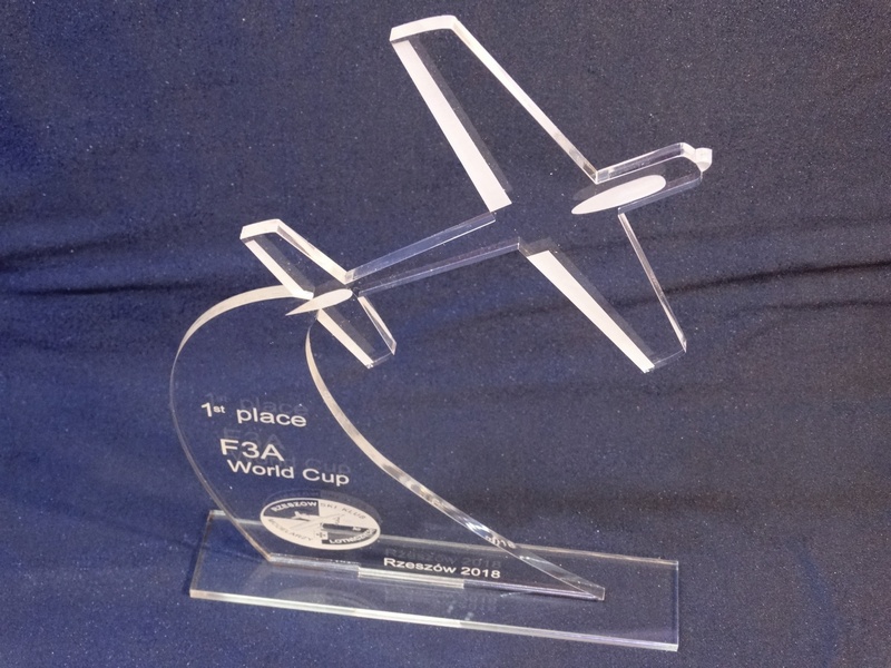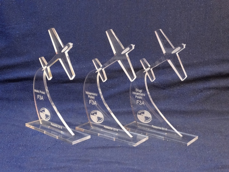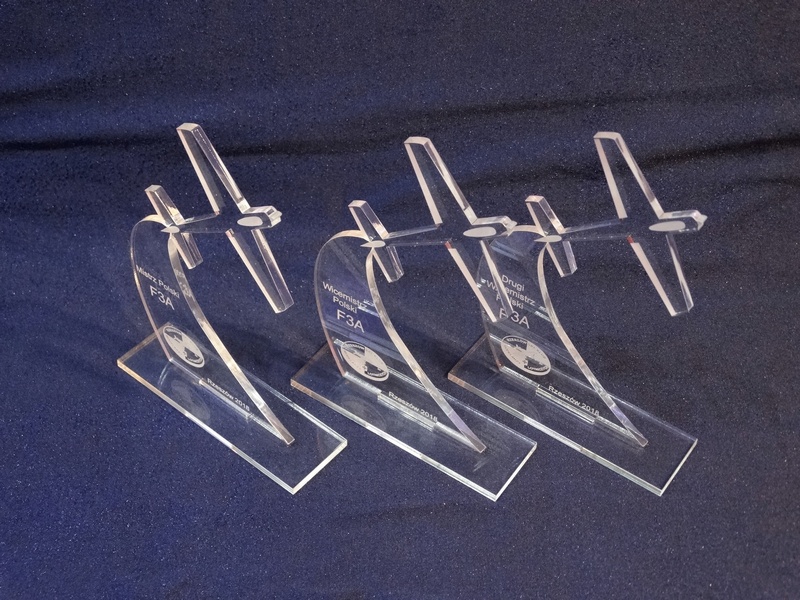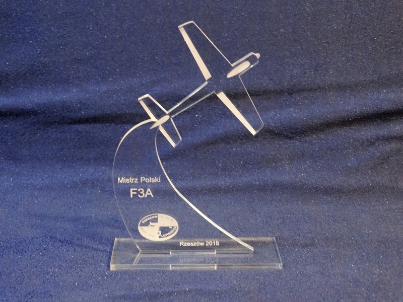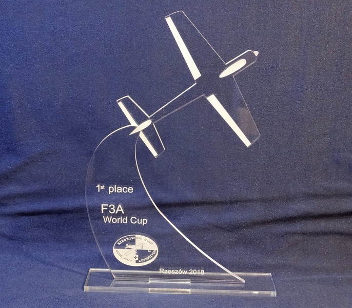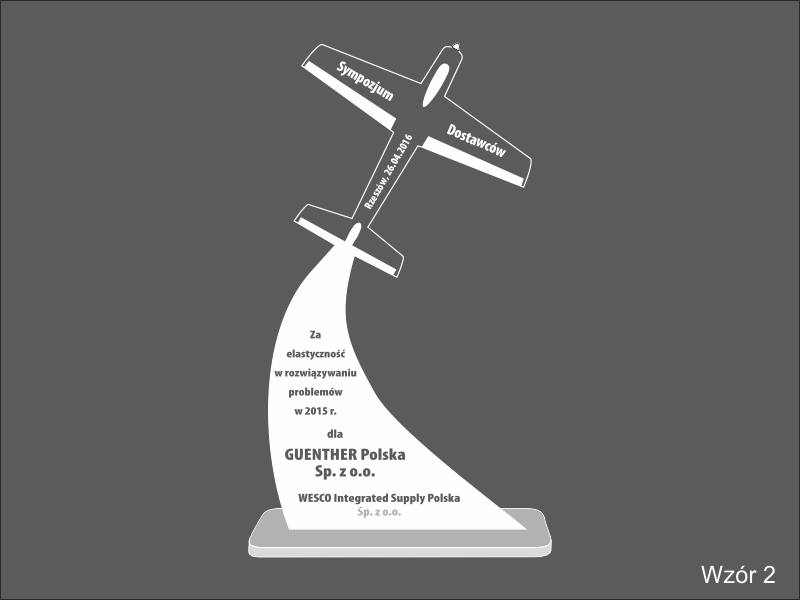Statuetka Samolot wykonana z bezbarwnej pleksi z grawerem dedykacji, logotypu, emblematu i ozdobnych grafik.