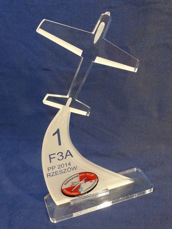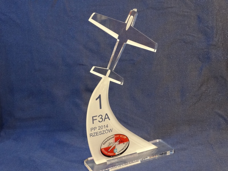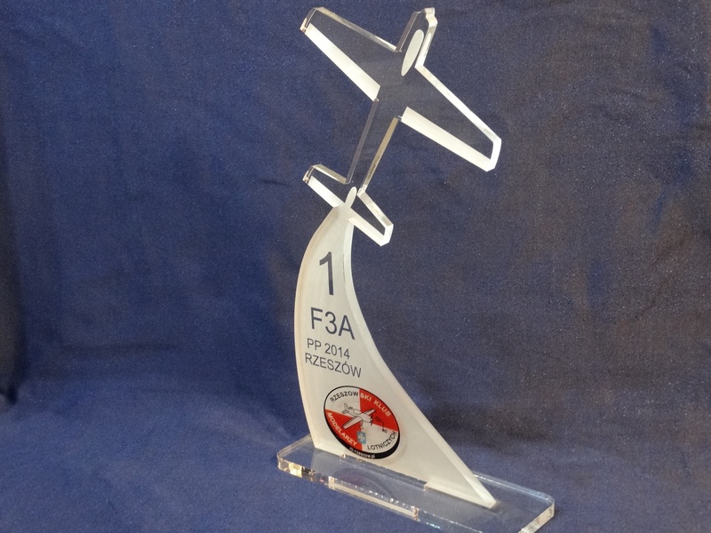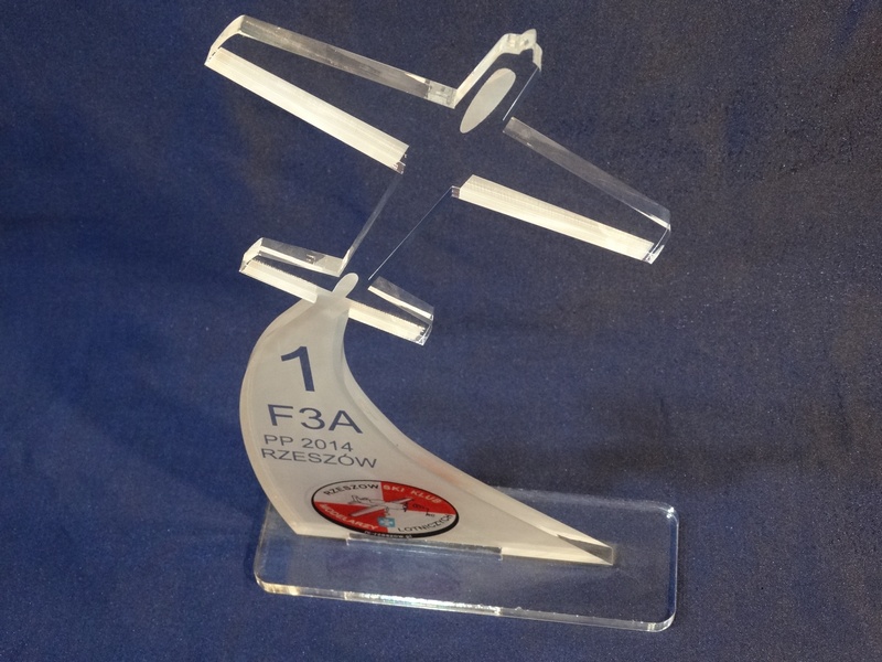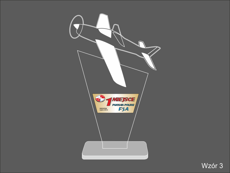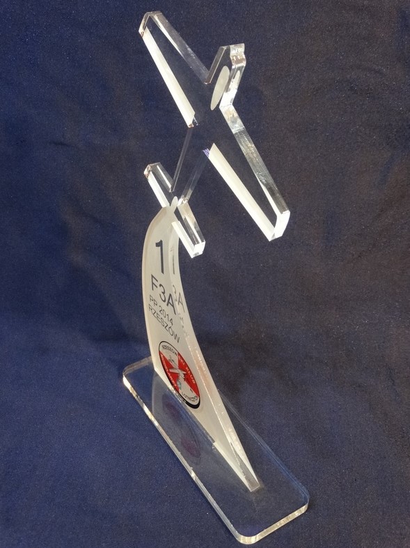 Statuetka Samolot wykonana z bezbarwnej pleksi z grawerem i nadrukiem dedykacji, logotypu, emblematu i ozdobnych grafik.