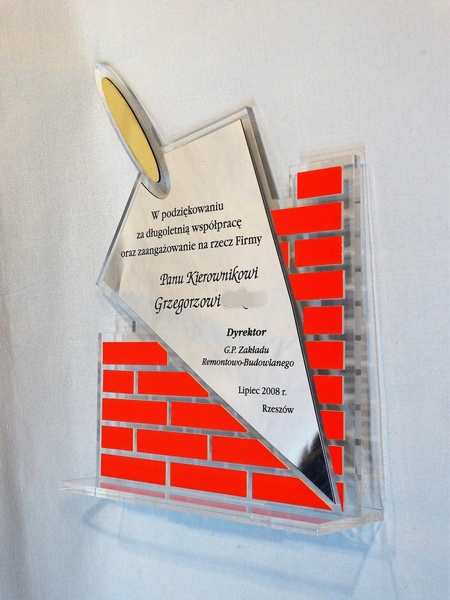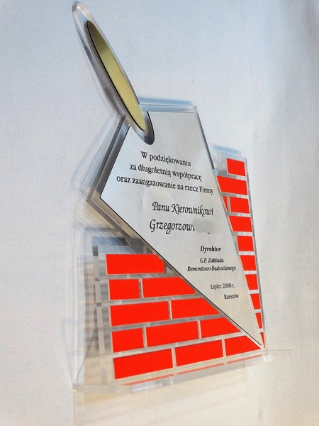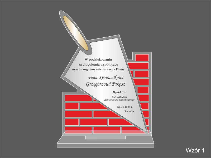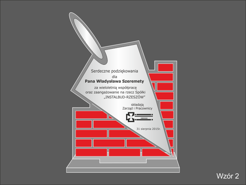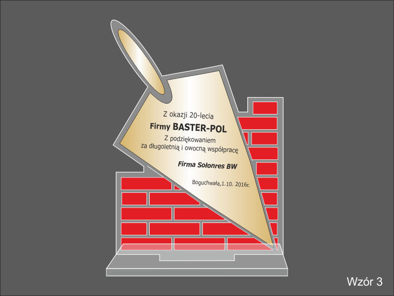 Dodatkowo na statuetce umieszczone są laminaty grawerskie złote, srebrne i czerwone imitujące kielnię oraz ceglany mur.