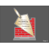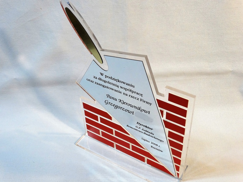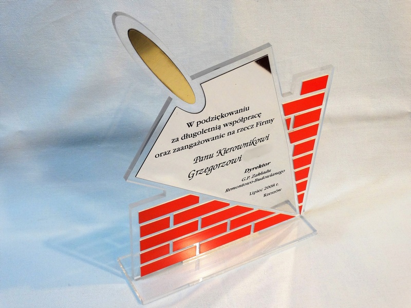 Statuetka "Kielnia" wykonana z bezbarwnej pleksi i laminatów, z grawerem dedykacji i ozdobnych grafik.