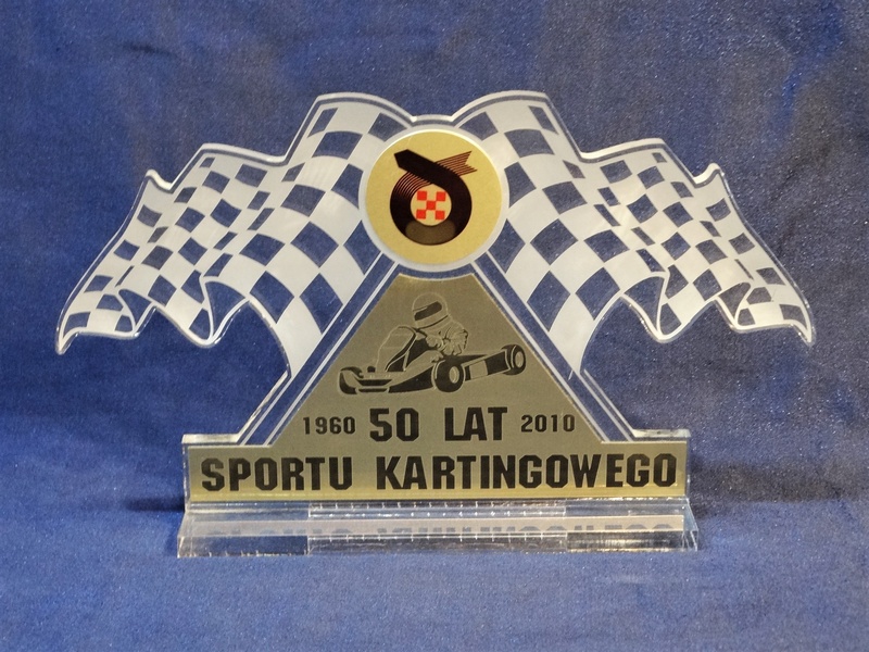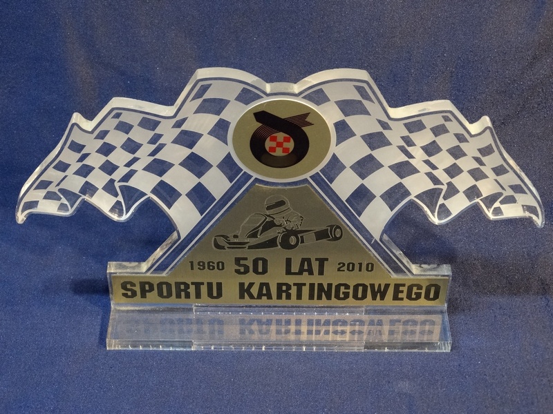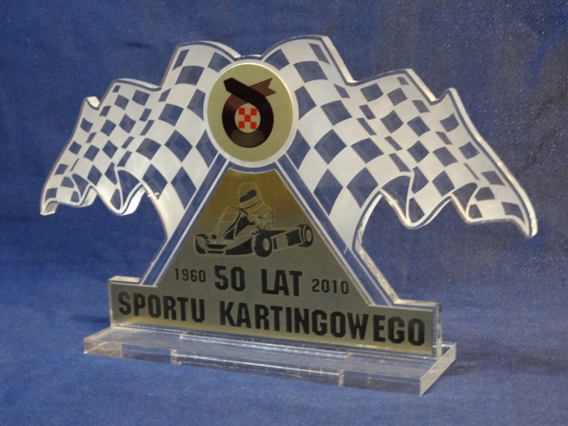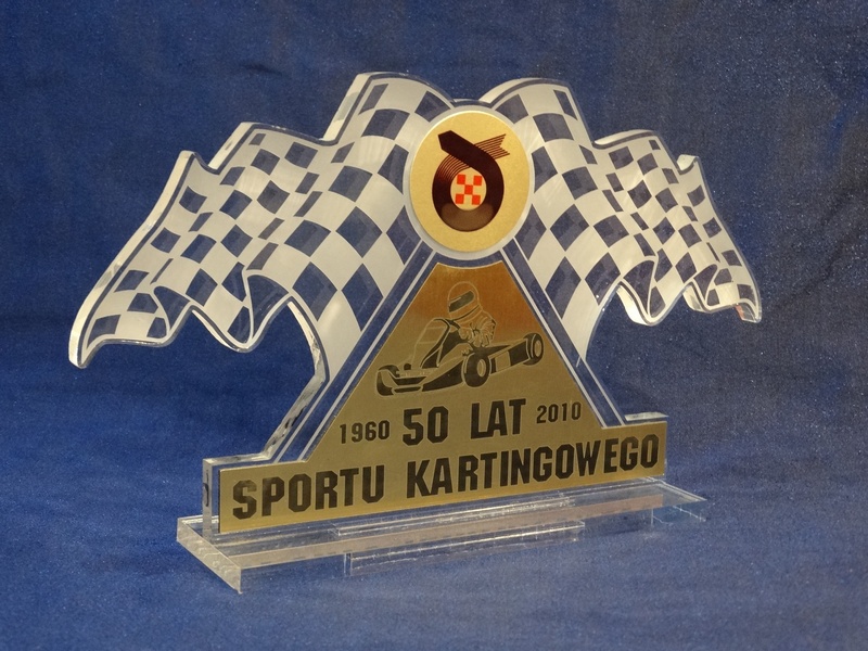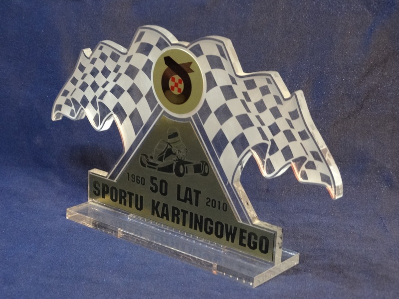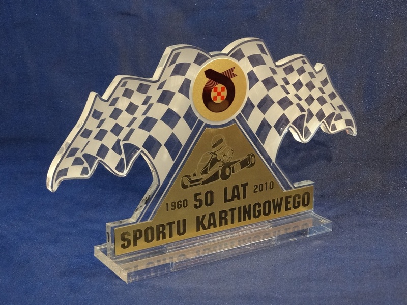 Statuetka Motoryzacyjna wykonana z bezbarwnej pleksi i laminatu z grawerem dedykacji, logotypu, emblematu i grafik.
