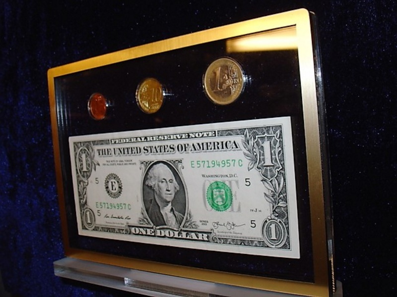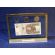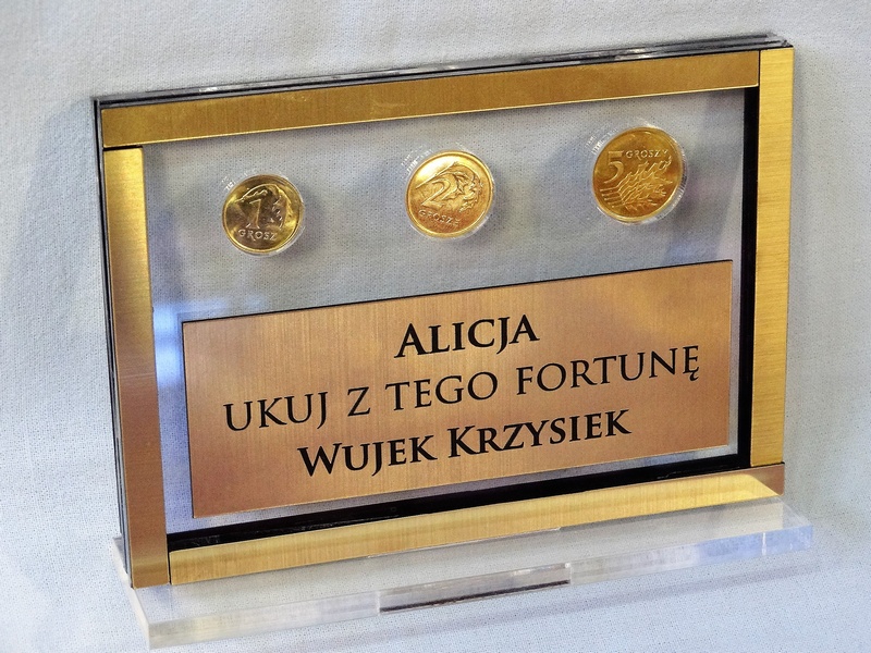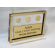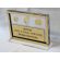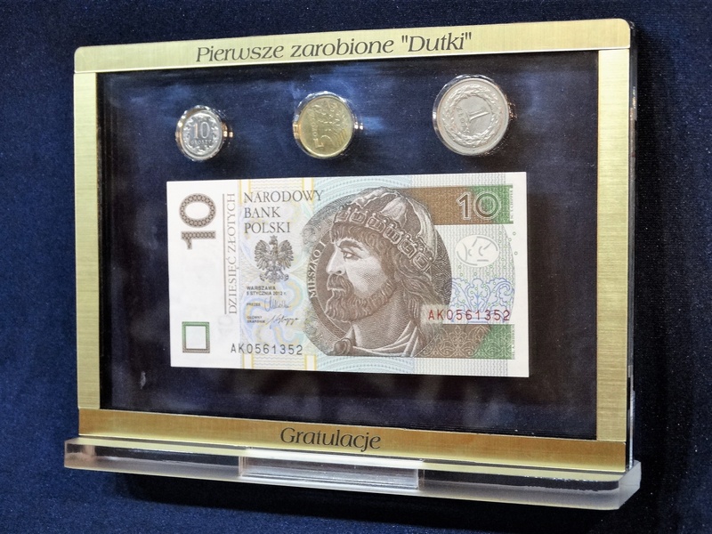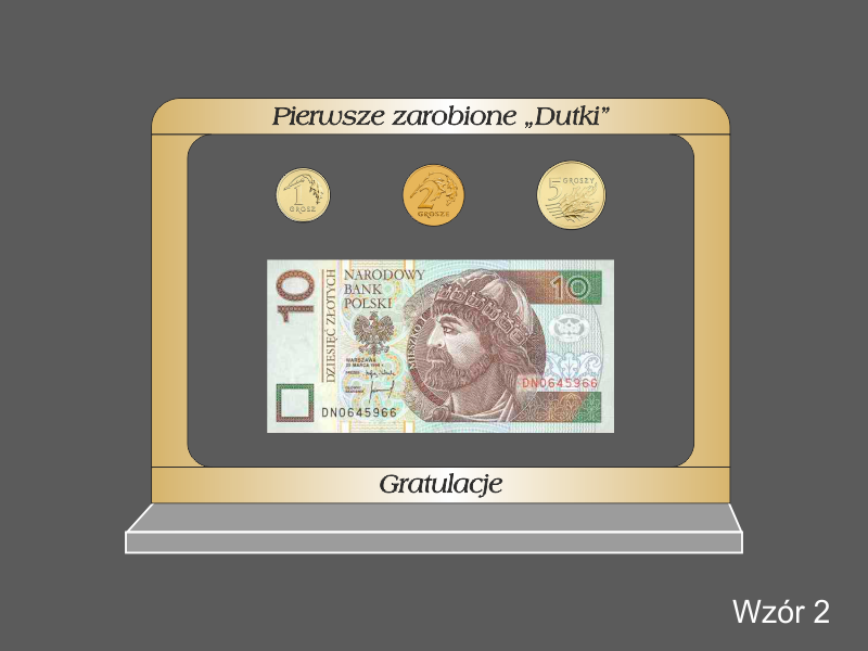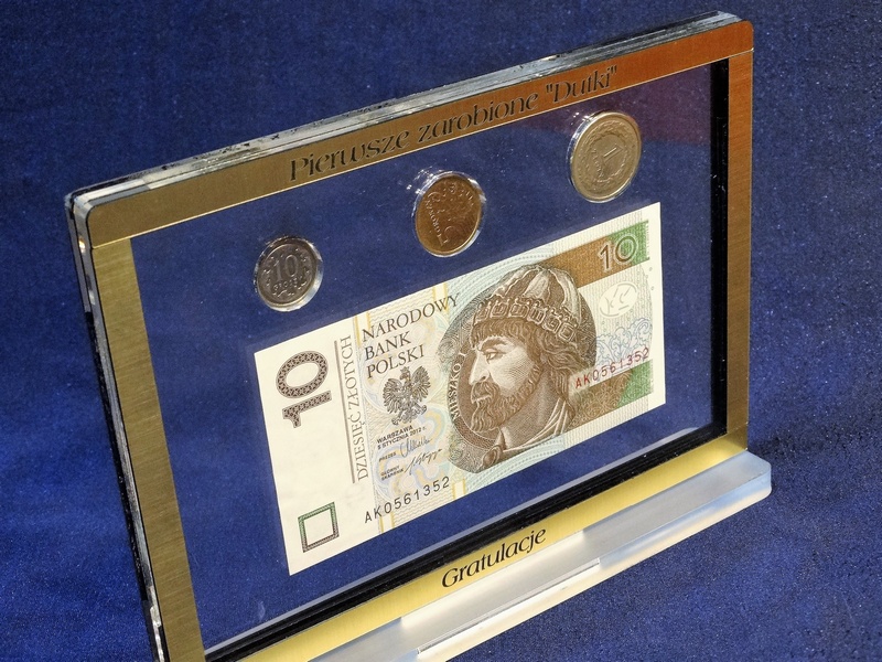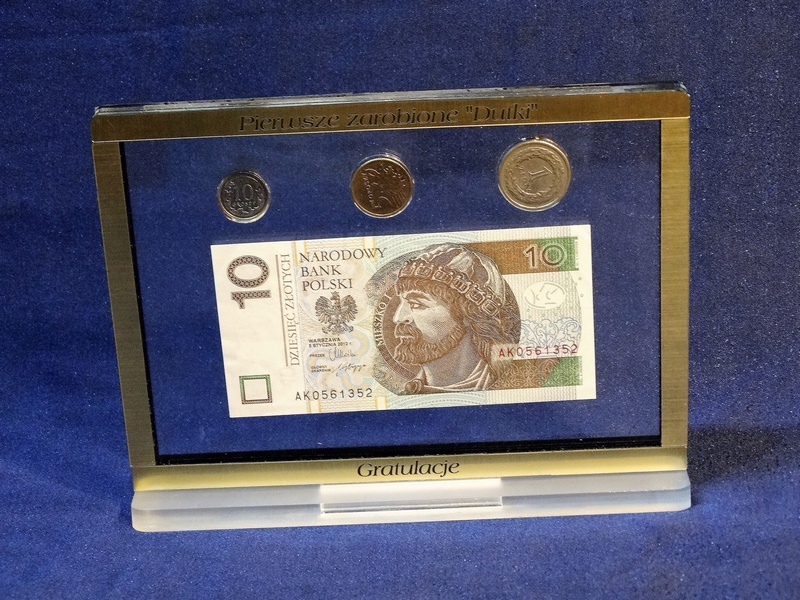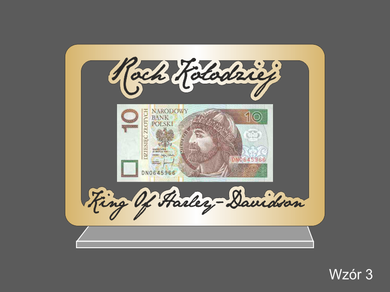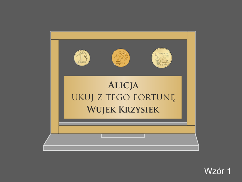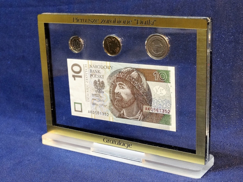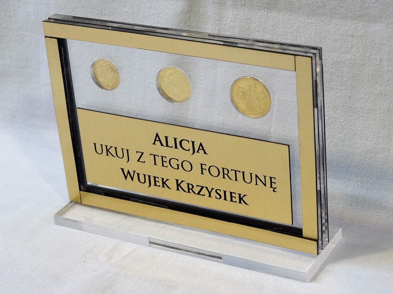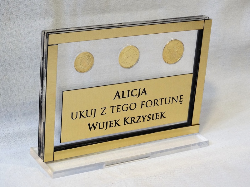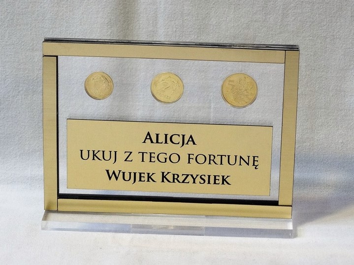 Prostokątna statuetka z umieszczonym wewnątrz banknotem i/lub monetami, wykonana z bezbarwnej pleksi i laminatów, z grawerem dedykacji.