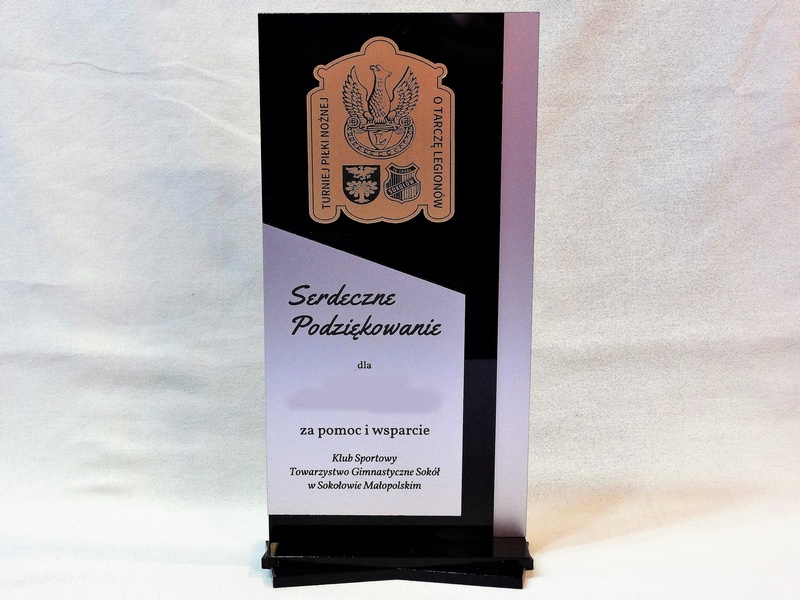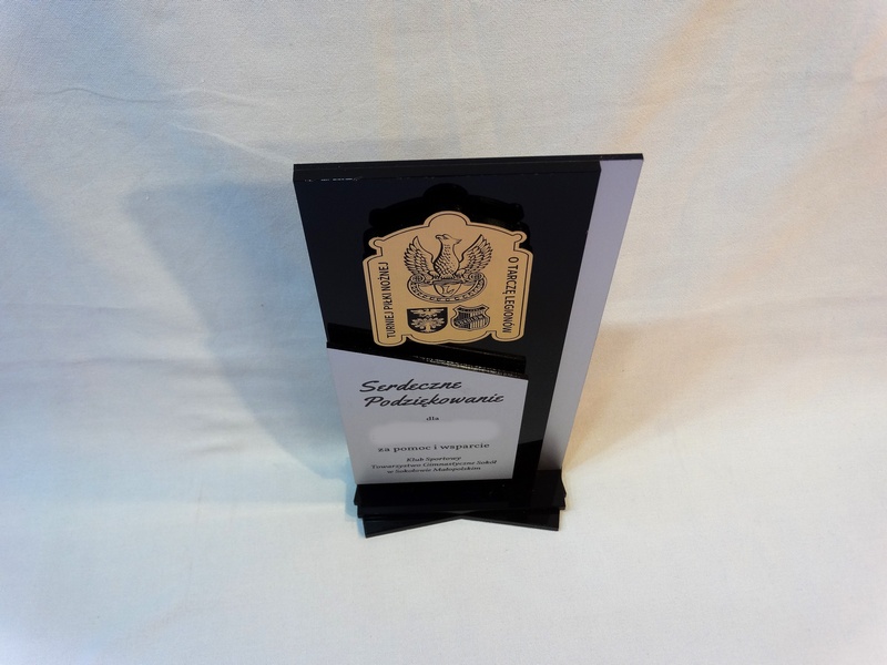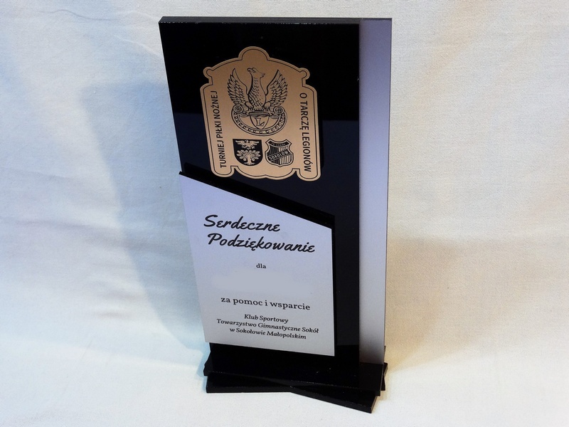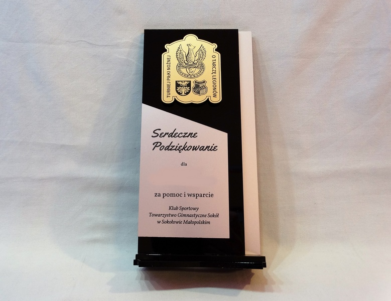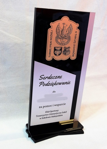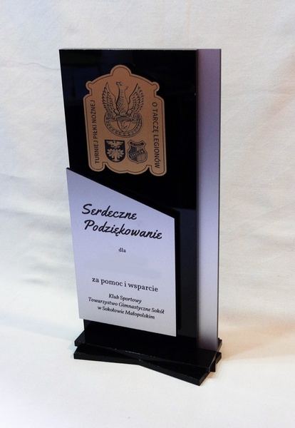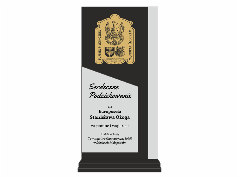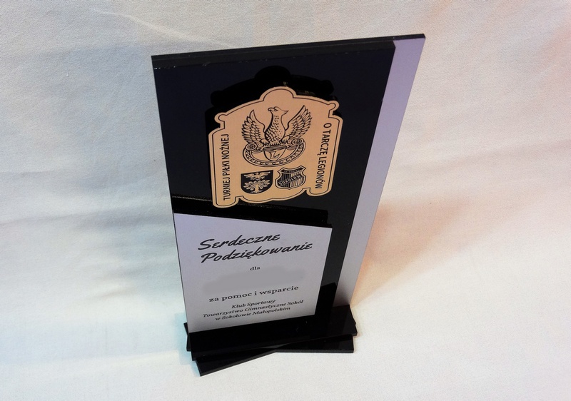 Dodatkowo na statuetce umieszczone są laminaty grawerskie z dedykacją oraz z herbem (emblematem).