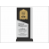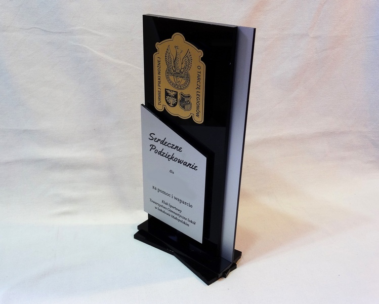 Złożona statuetka wykonana z czarnej pleksi i laminatów, z grawerem dedykacji i ozdobnych grafik.