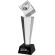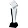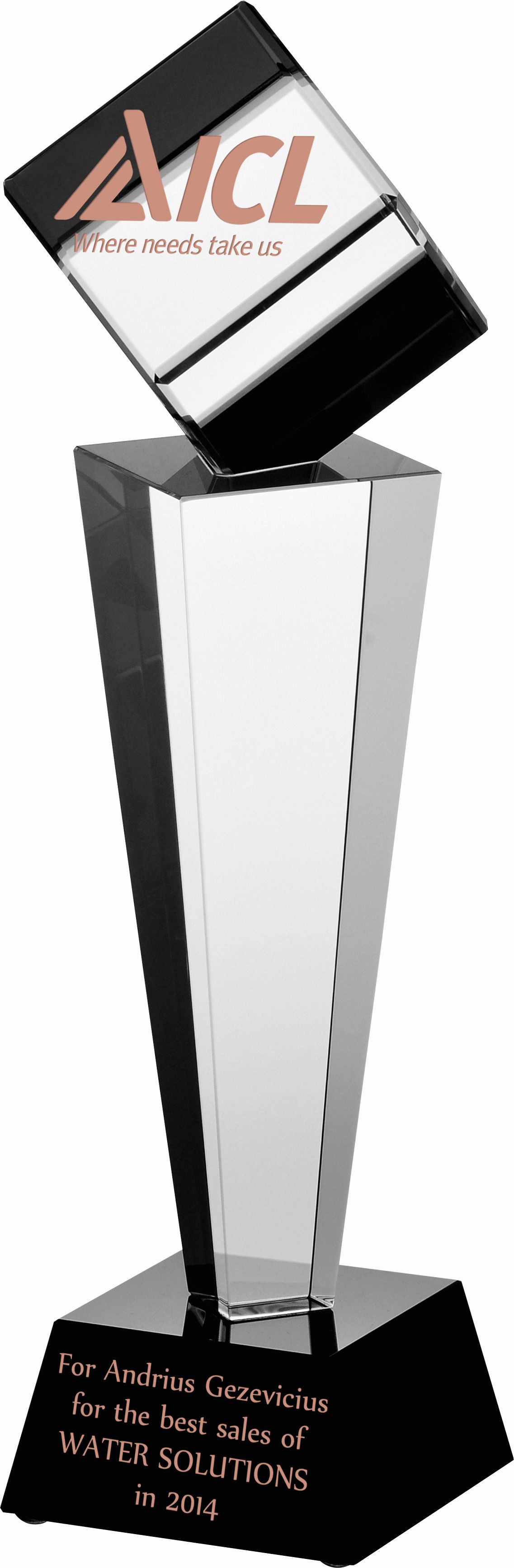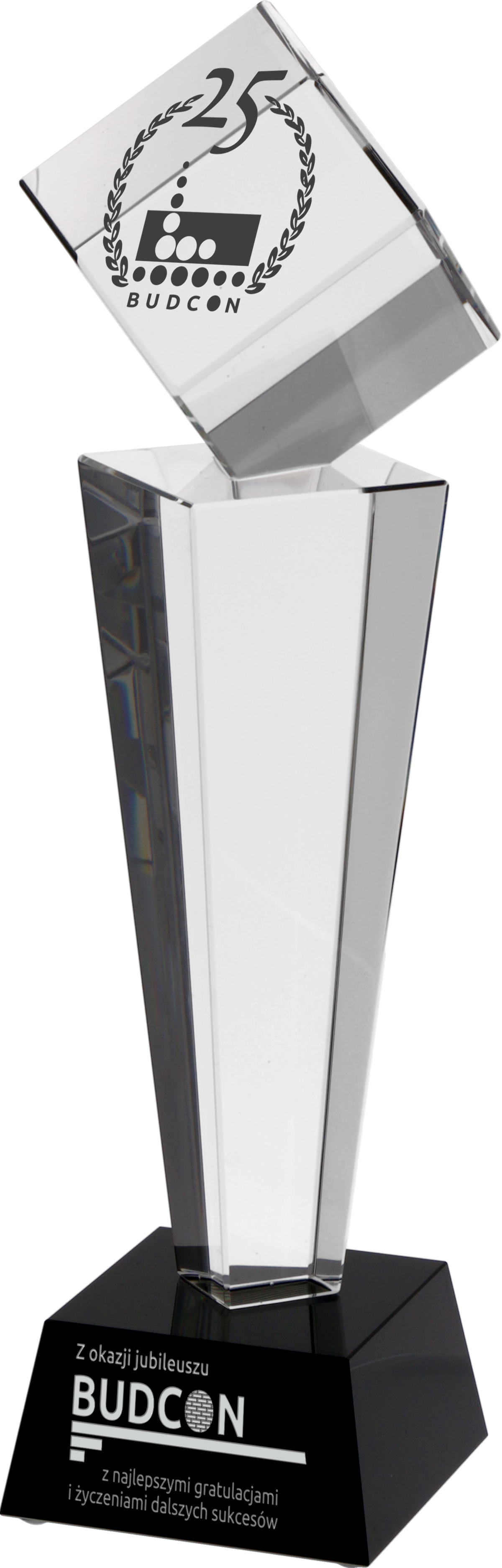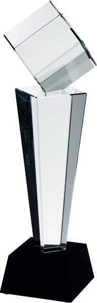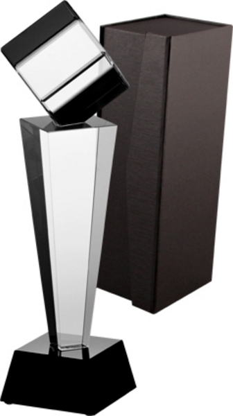 Statuetka szklana ma formę kostki osadzonej na pionowym filarze i czarnym postumencie.