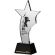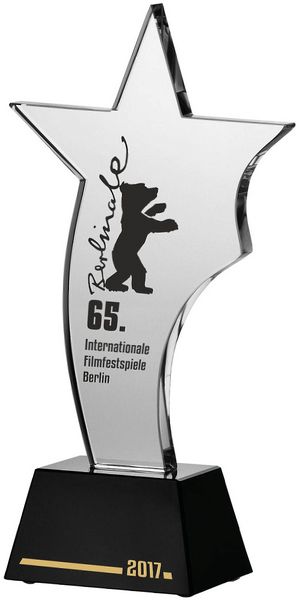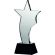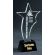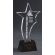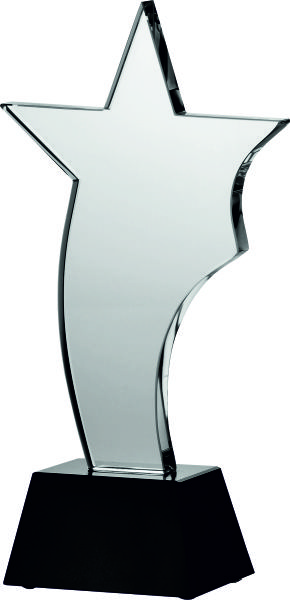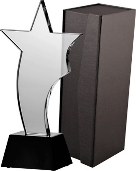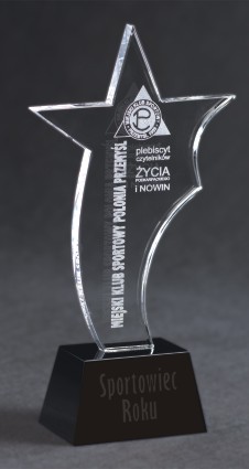 Statuetka szklana ma formę gwiazdy na czarnym postumencie.