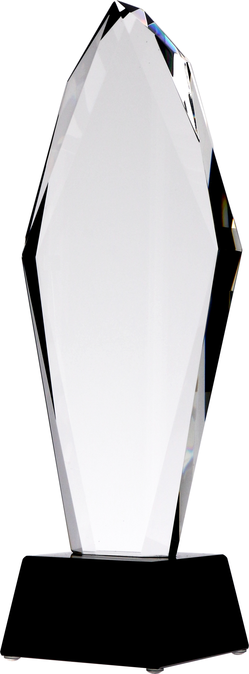 Statuetka szklana ma wydłużony deltoidalny kształt i szlifowane krawędzie.