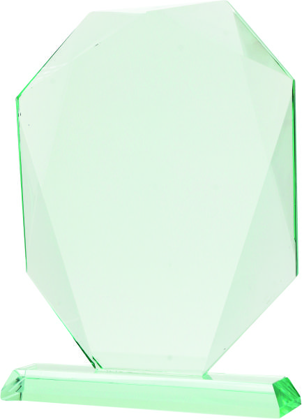 Statuetka szklana z grubego szkła ma kształt szlifowanego symetrycznego ośmiokąta.