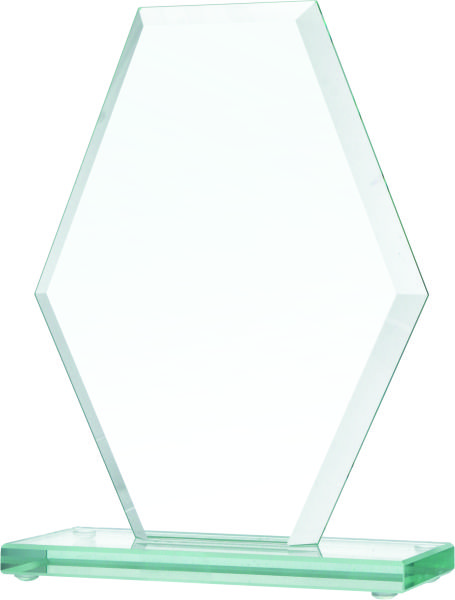 Statuetka szklana ma kształt szlifowanego symetrycznego sześciokąta.