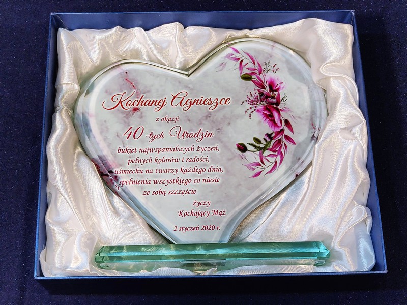 Statuetka szklana G041 w kształcie serca z grubego szkła z grawerem lub nadrukiem w etui.