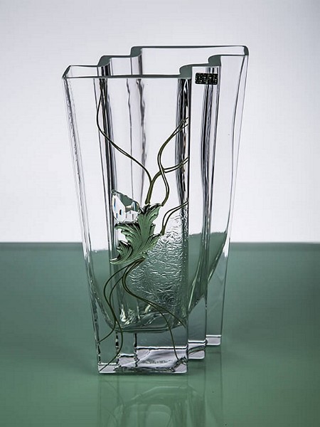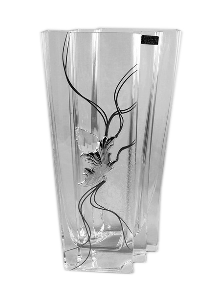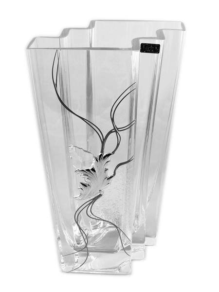 Na wazonie centralnie umieszczony jest efektowny kryształ połączony z srebrnym liściem i wąsami oraz przezroczystym motywem roślinnym, który wygląda jak zatopiony i malowany na szkle.
